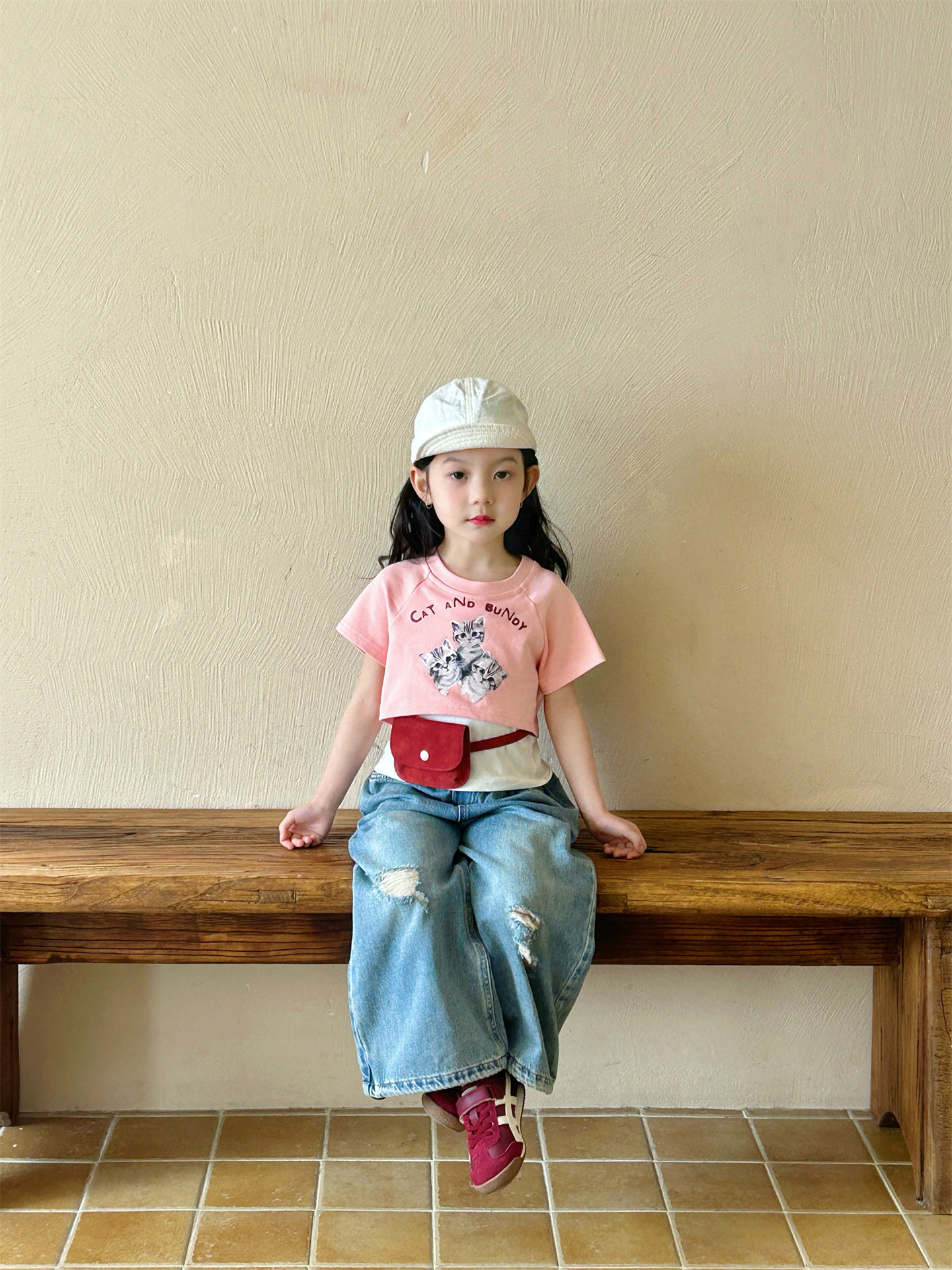 2025 여름 새 소녀의 서양식 만화 새끼 고양이 가짜 투피스 반팔 티셔츠 리핑 청바지 투피스 세트스토어 가기