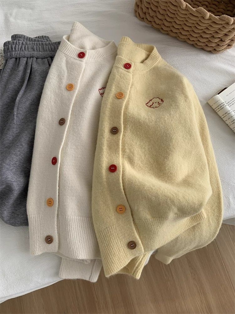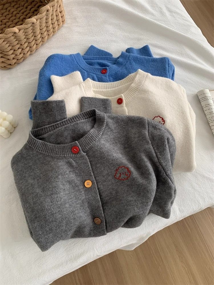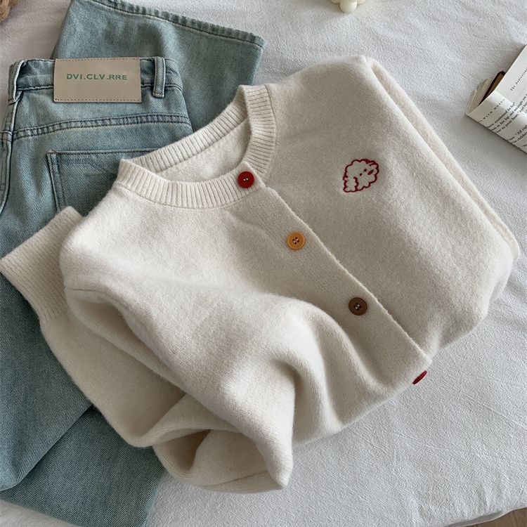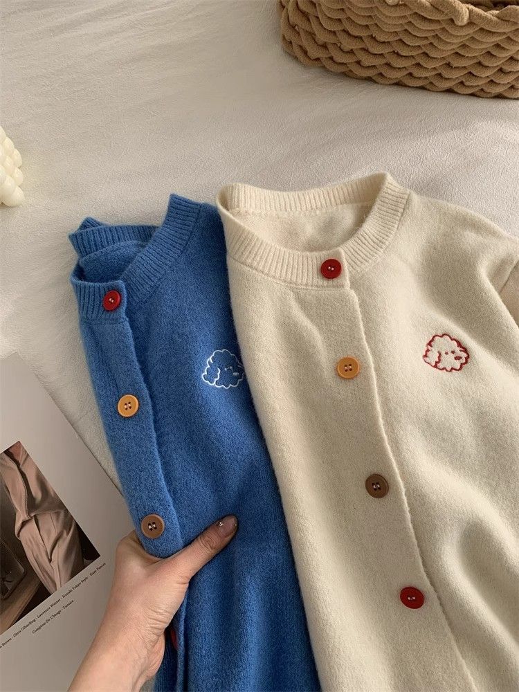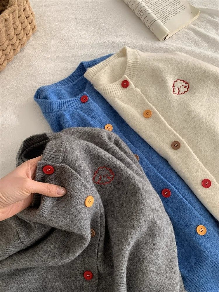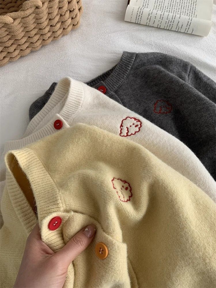 [양털] 부드럽고 젊어보이는 강아지 자수 컬러 버튼 라운드넥 니트 가디건 여성용 소형 스웨터 코트