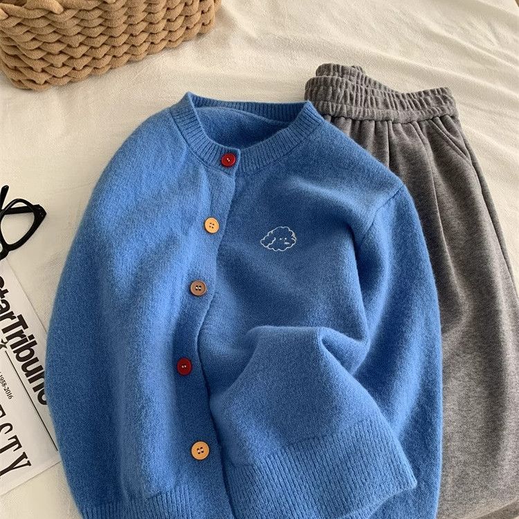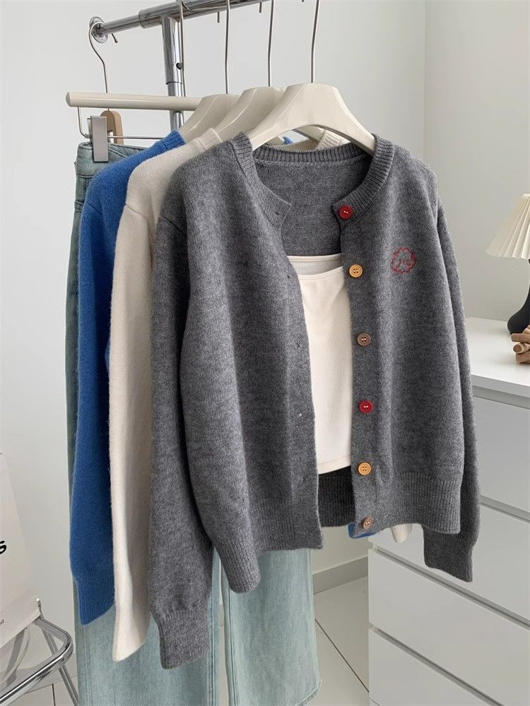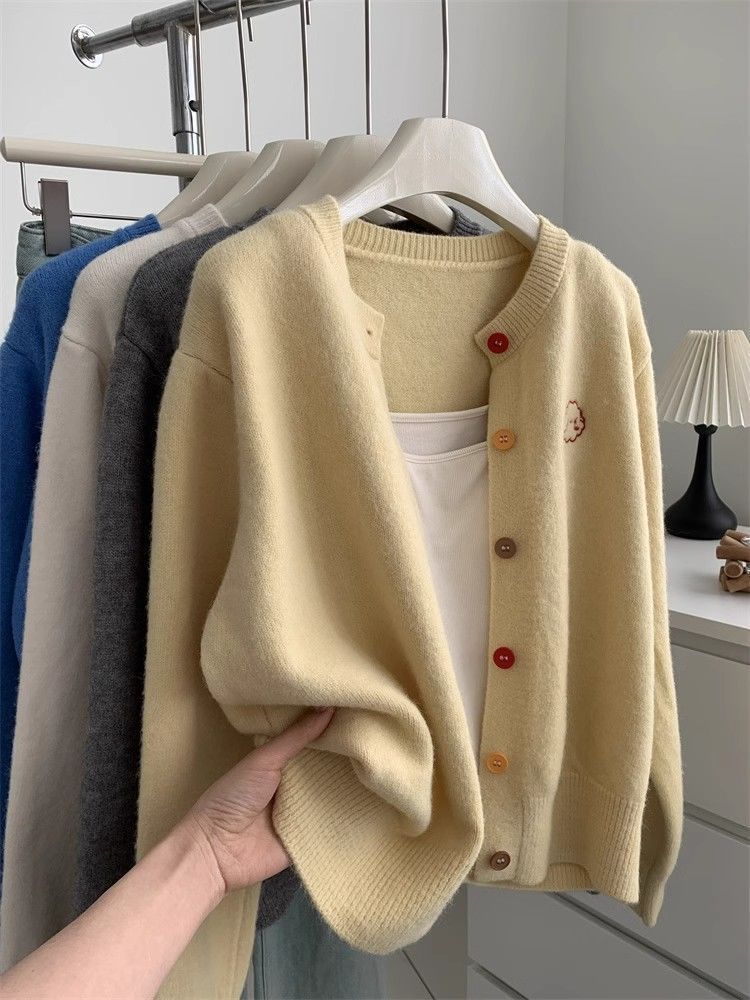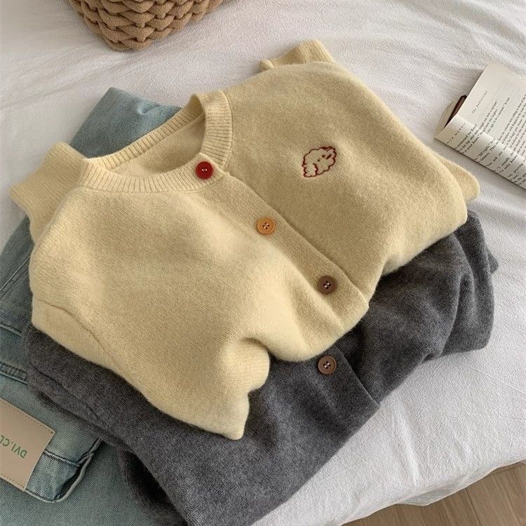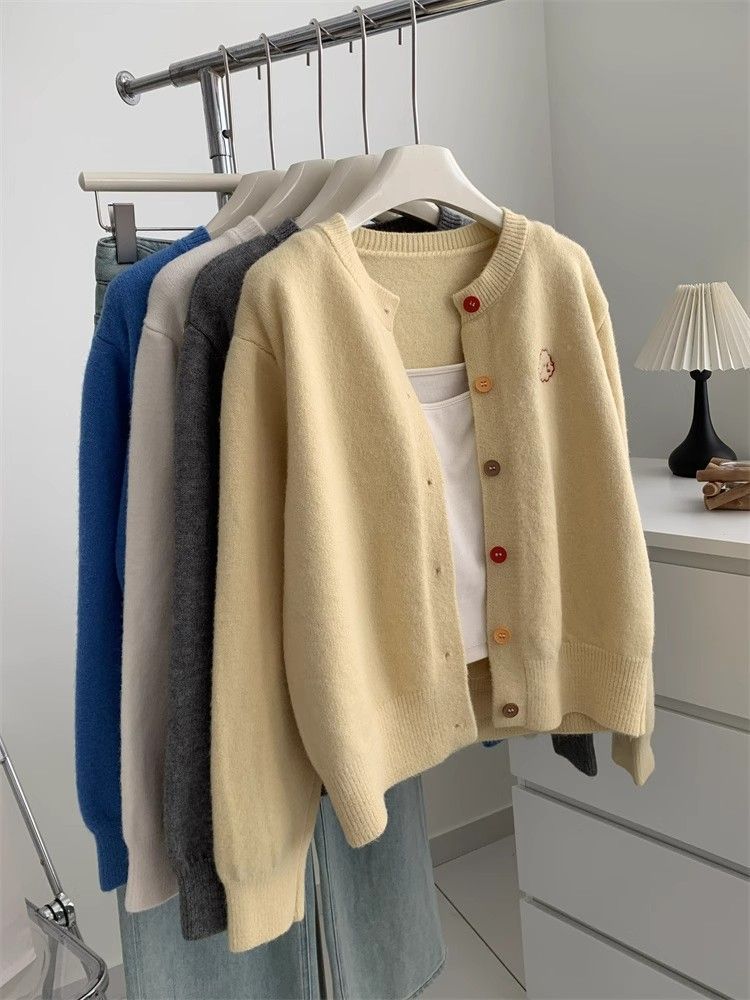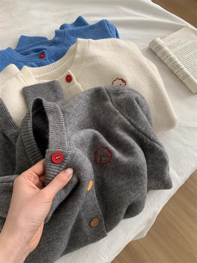 [양털] 부드럽고 젊어보이는 강아지 자수 컬러 버튼 라운드넥 니트 가디건 여성용 소형 스웨터 코트