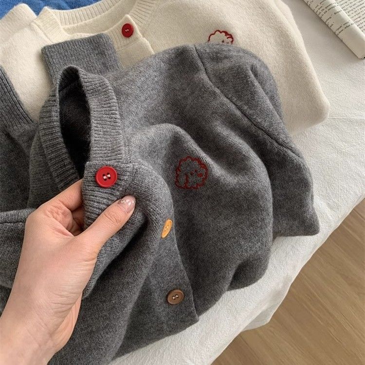 [양털] 부드럽고 젊어보이는 강아지 자수 컬러 버튼 라운드넥 니트 가디건 여성용 소형 스웨터 코트스토어 가기
