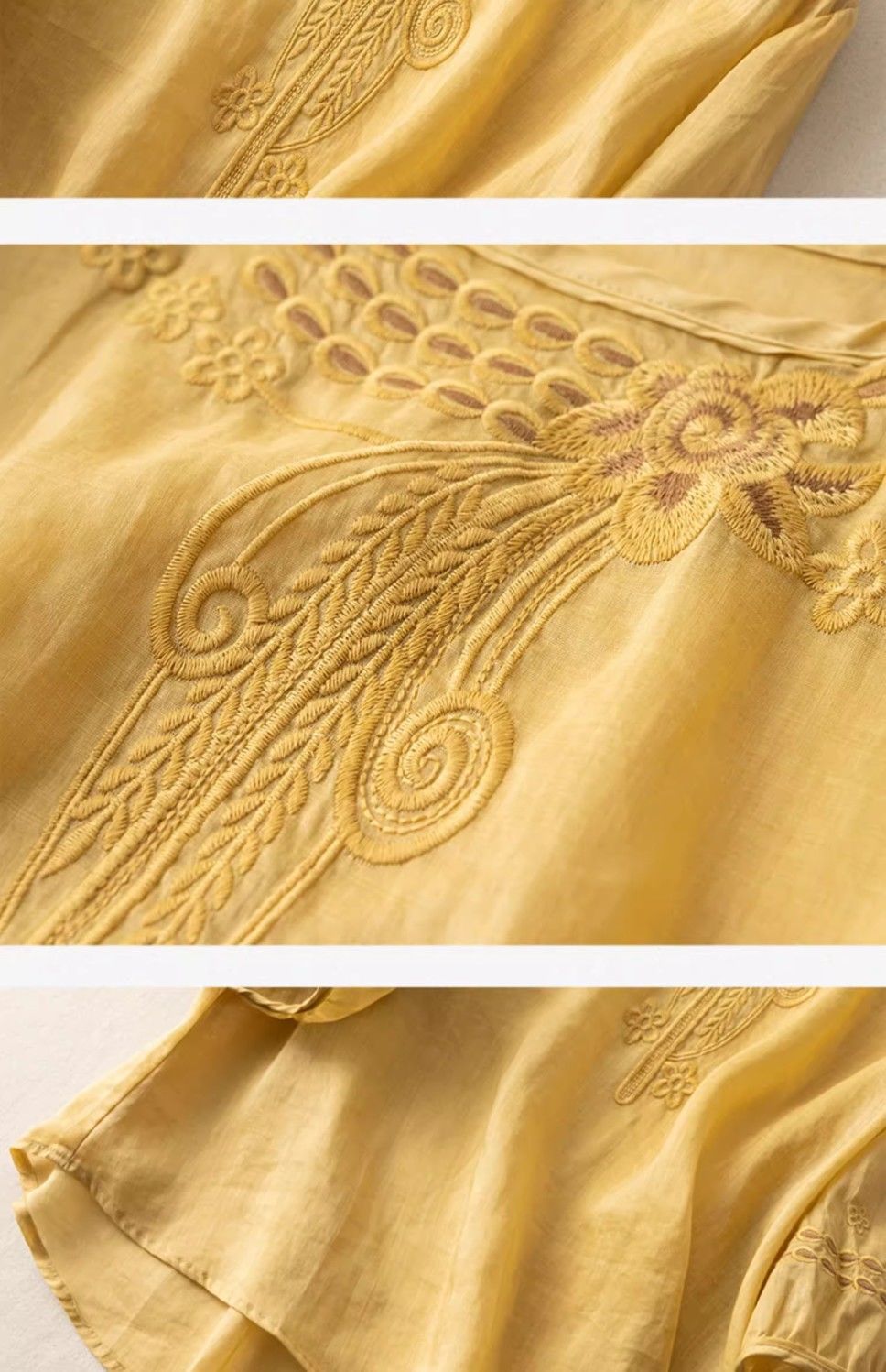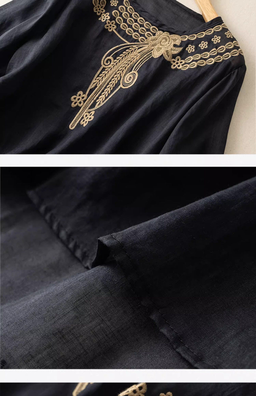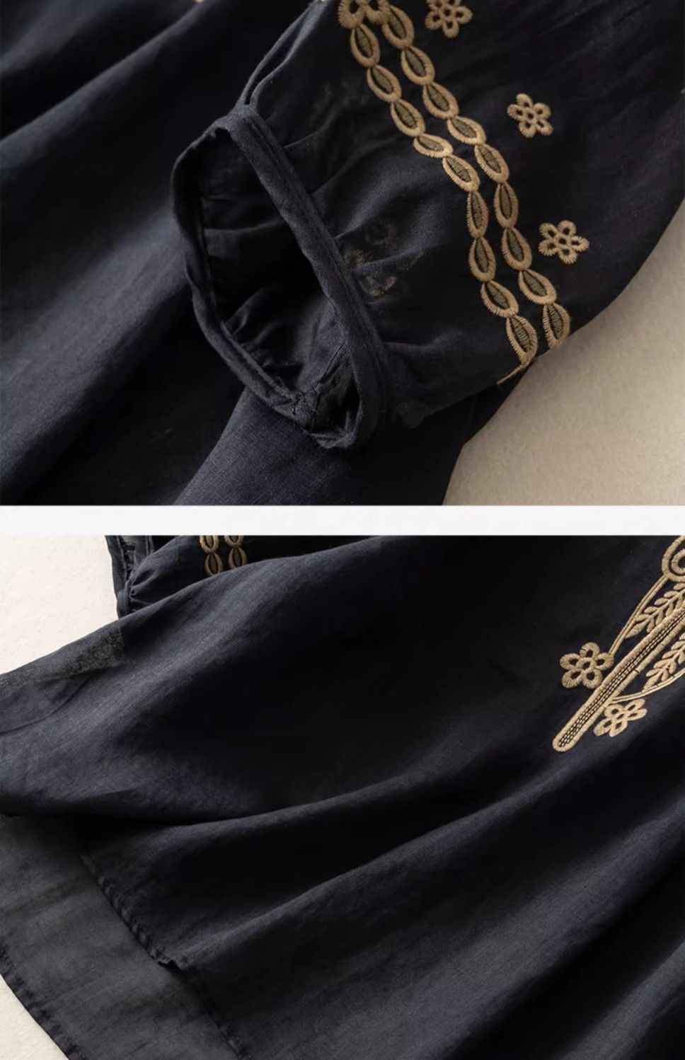 국경 면화와 린넨 탑 여성용 고급 복고풍 느슨한 플러스 사이즈 수 놓은 티셔츠 여름 새로운 얇은 반팔 셔츠