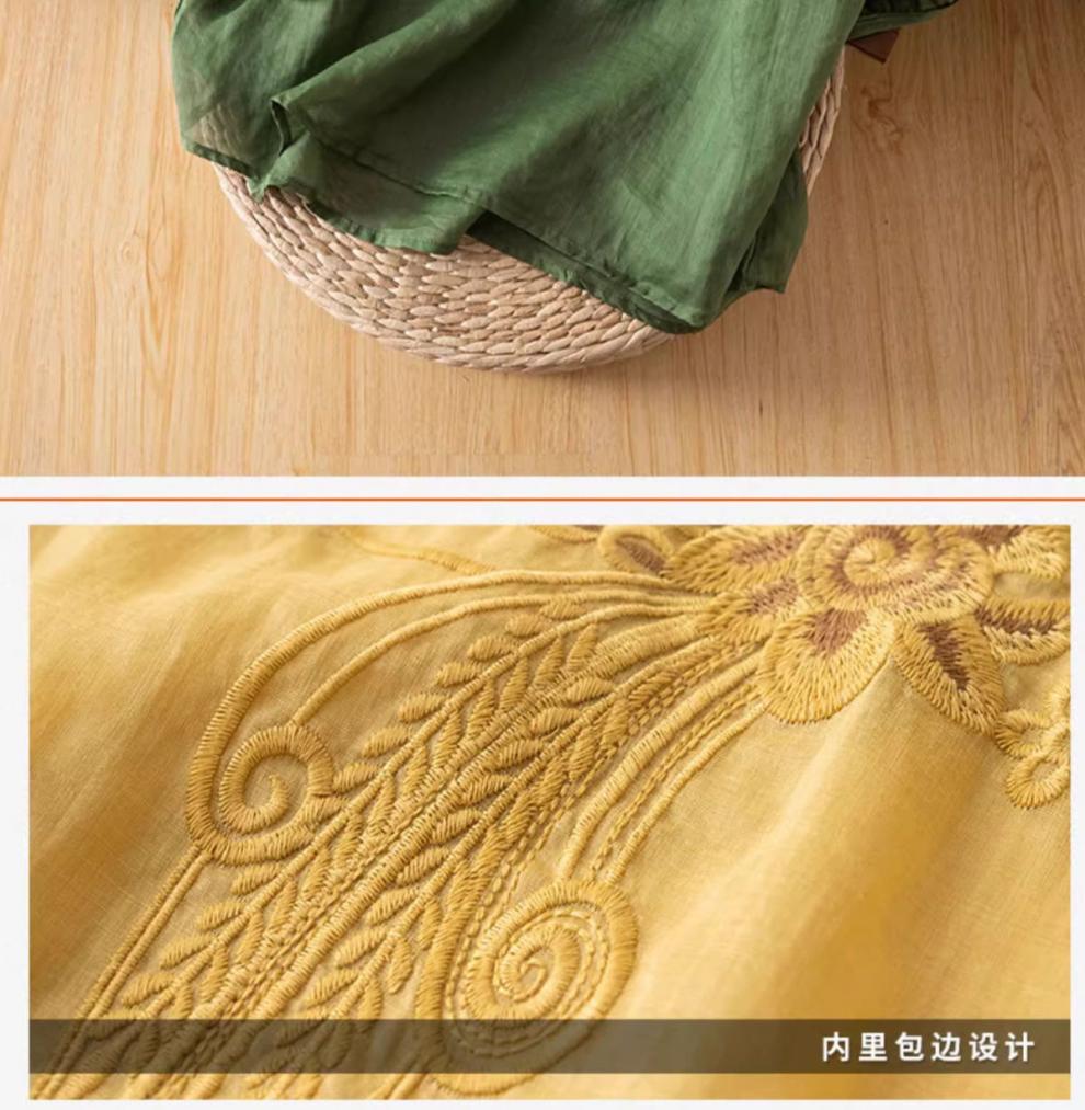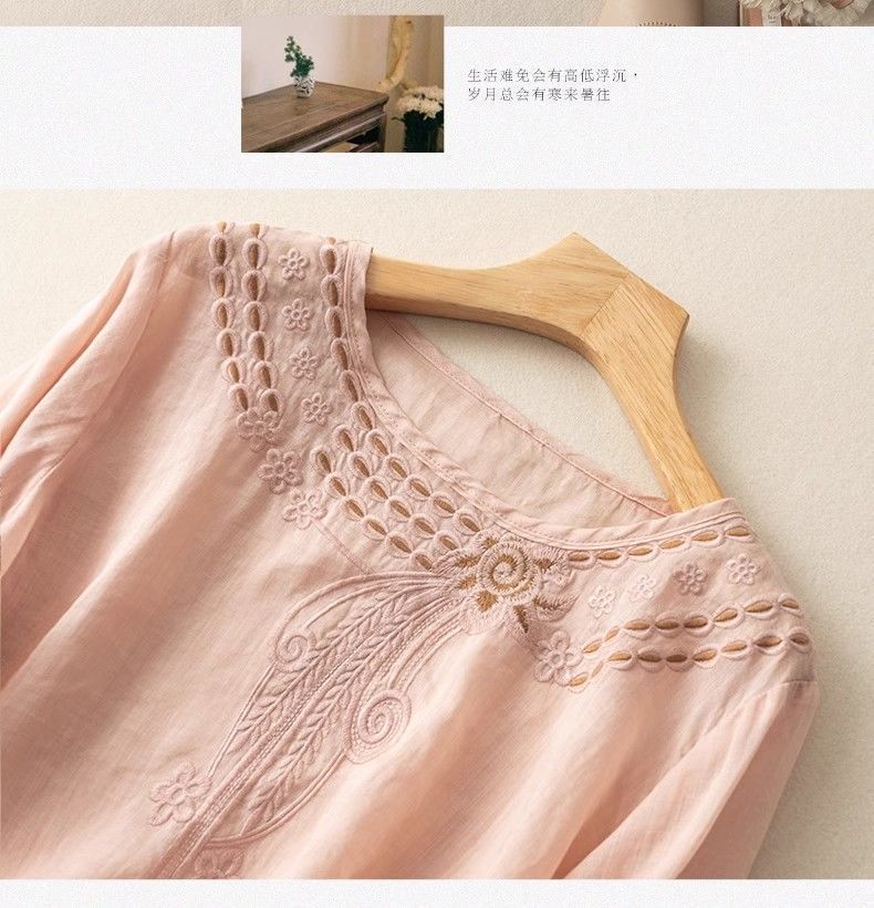 국경 면화와 린넨 탑 여성용 고급 복고풍 느슨한 플러스 사이즈 수 놓은 티셔츠 여름 새로운 얇은 반팔 셔츠스토어 가기