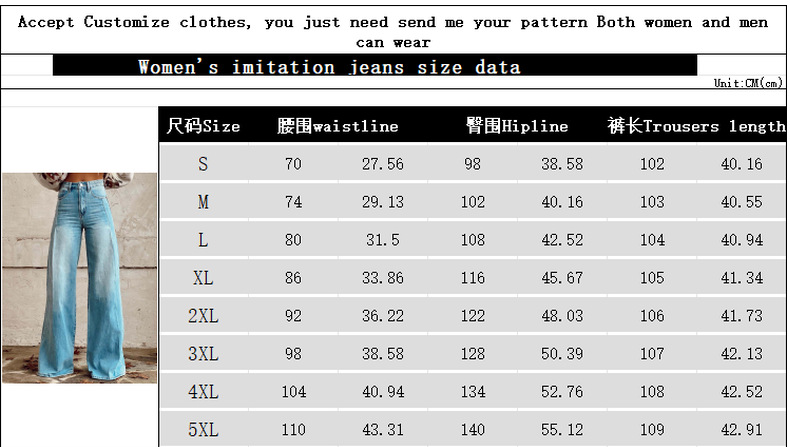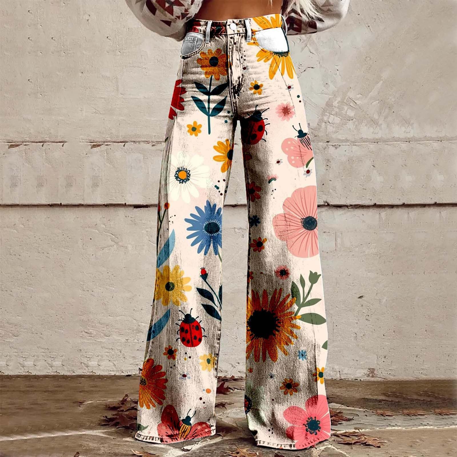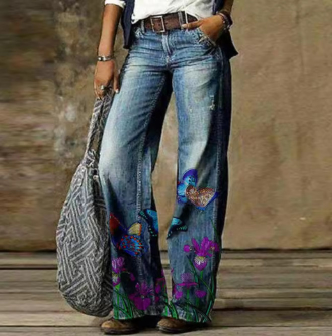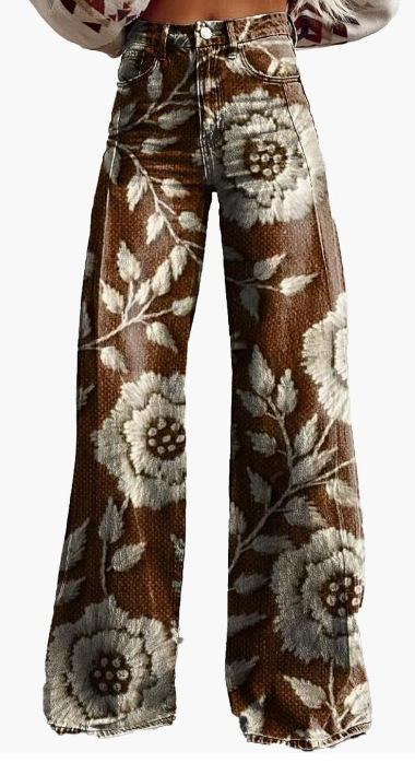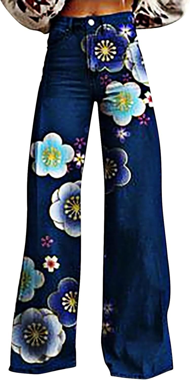 2025 프린트 오각형 모조 데님 여성용 와이드 팬츠 여성용 바지 플레어 팬츠 Amazon TEMU 핫 세일 여성용 바지스토어 가기