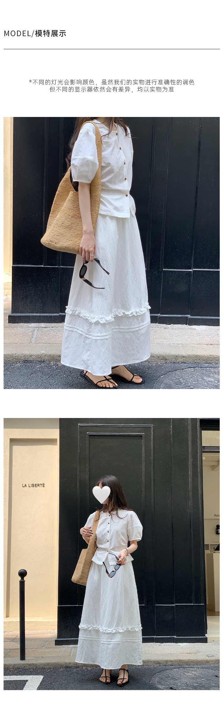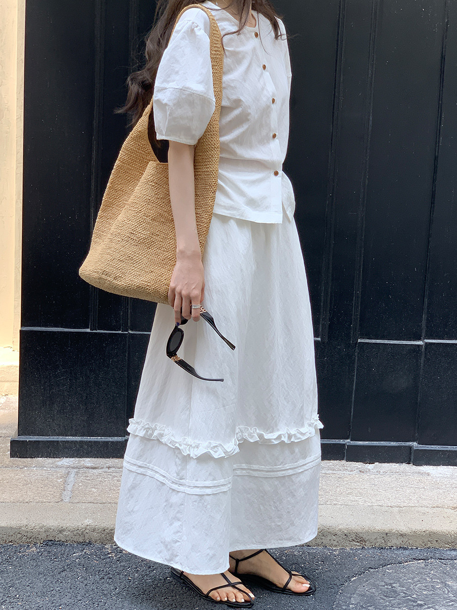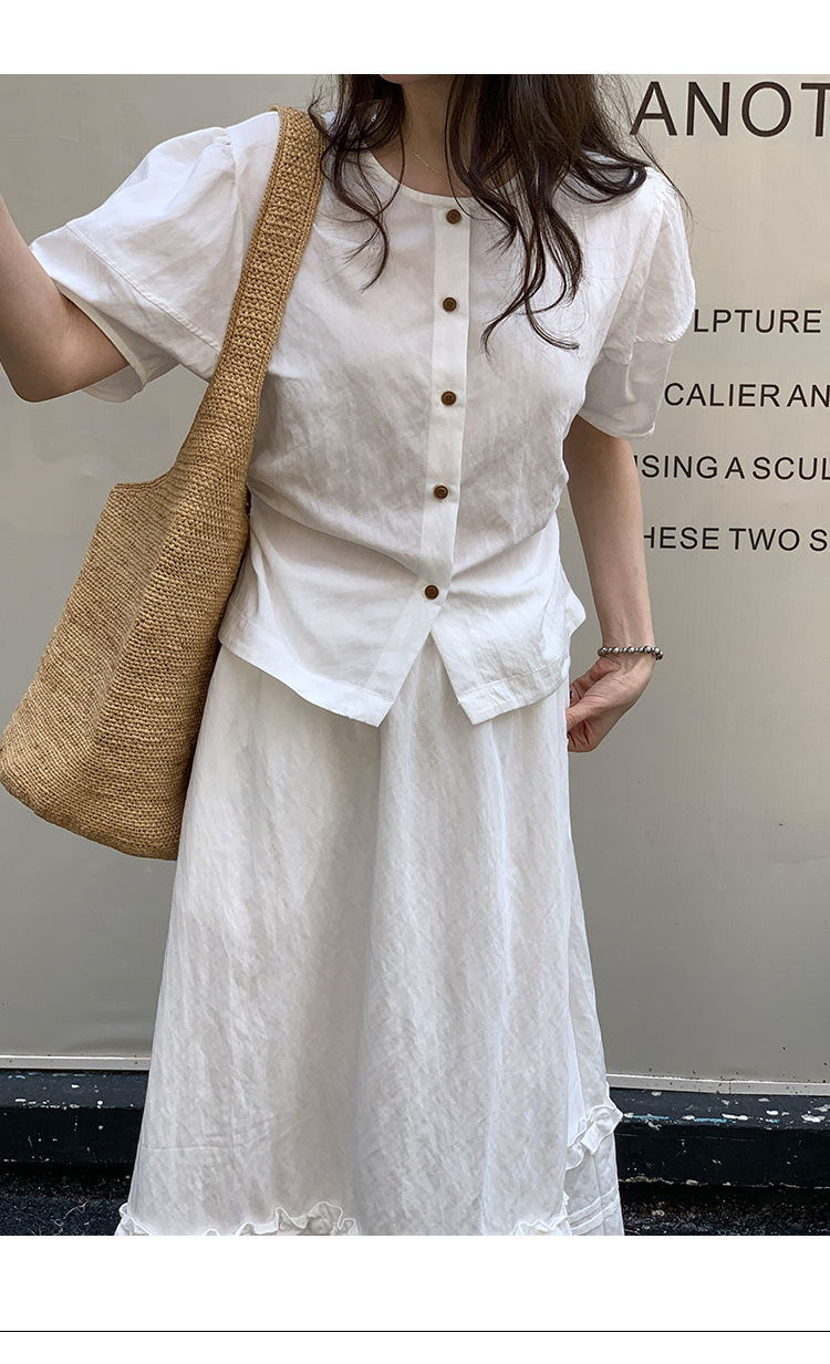 Wei Song 의류 여름 프랑스 크루 넥 버블 반팔 셔츠 탑 흰색 귀 테두리 높은 허리 스커트 여성