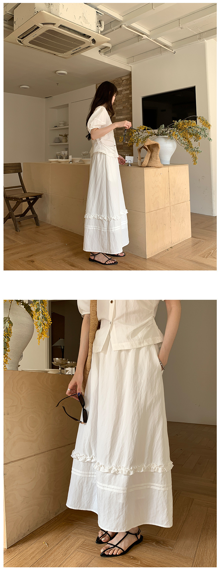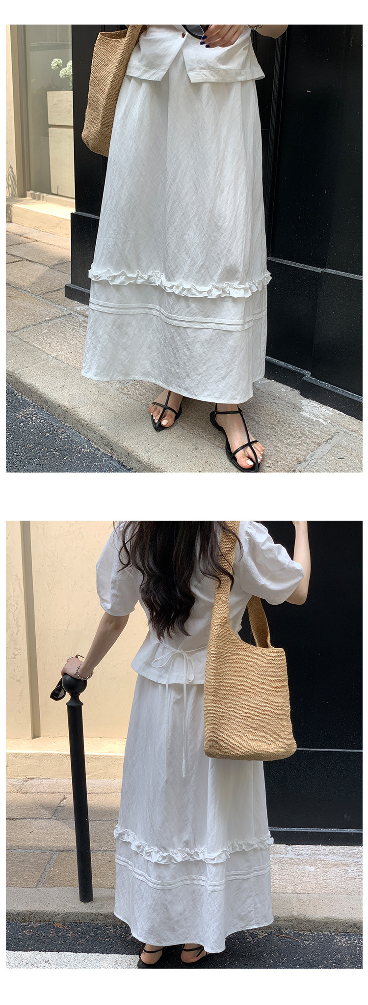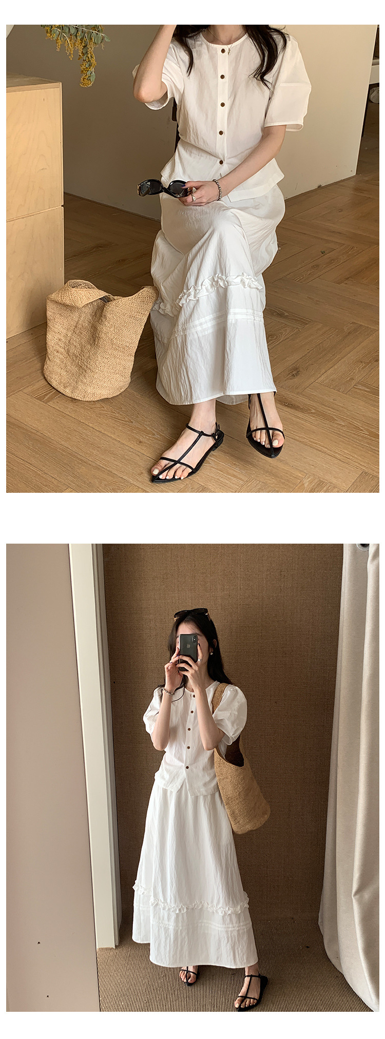 Wei Song 의류 여름 프랑스 크루 넥 버블 반팔 셔츠 탑 흰색 귀 테두리 높은 허리 스커트 여성