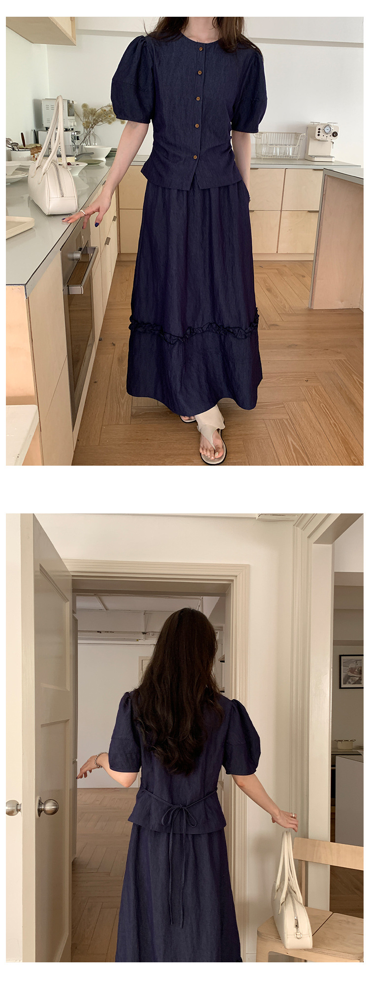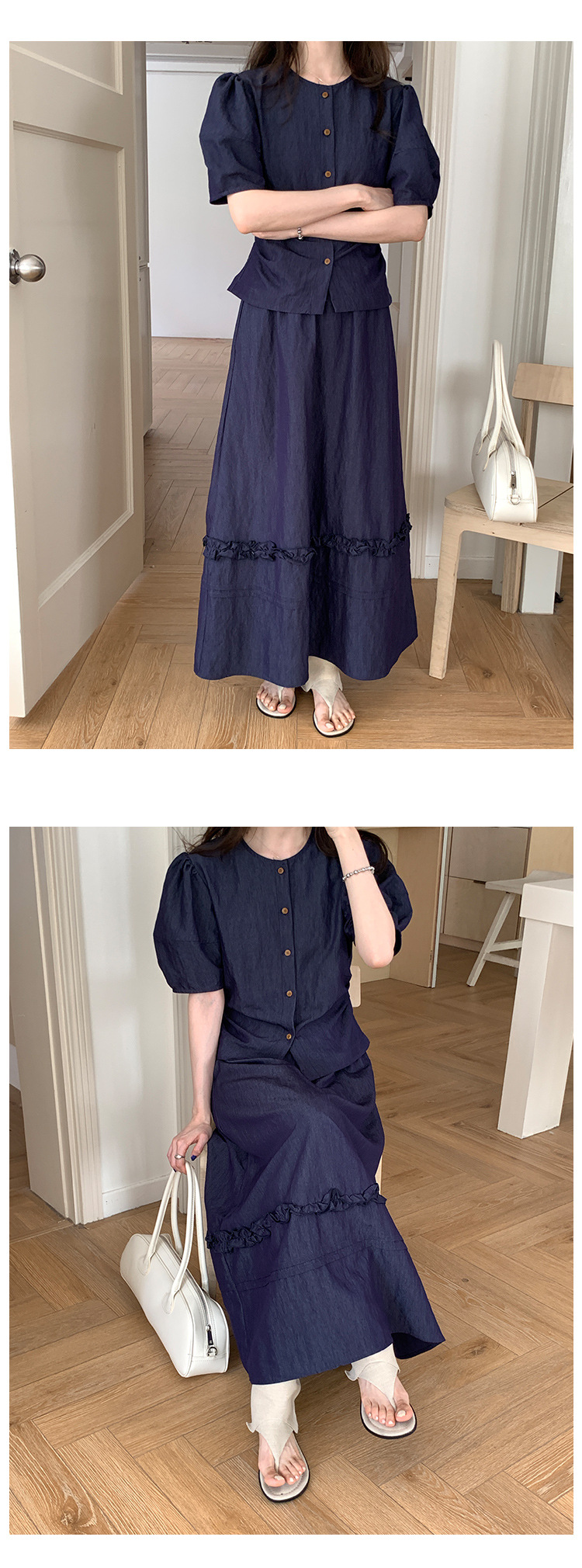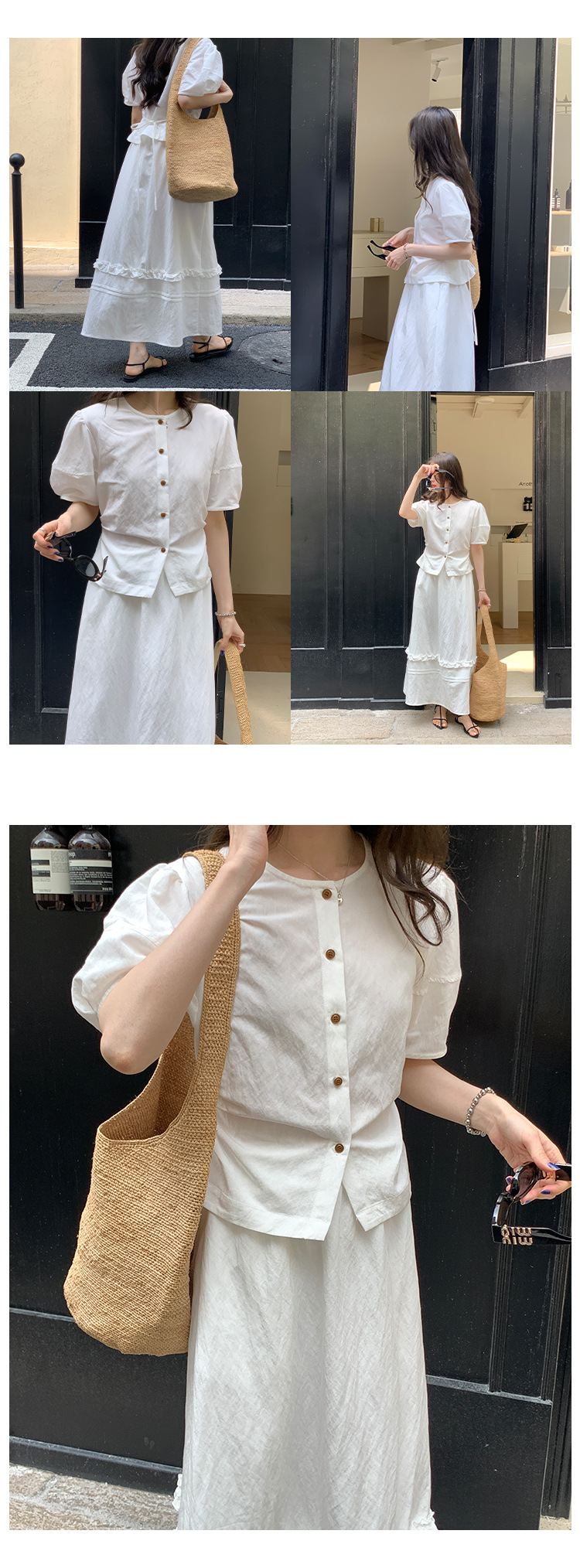 Wei Song 의류 여름 프랑스 크루 넥 버블 반팔 셔츠 탑 흰색 귀 테두리 높은 허리 스커트 여성스토어 가기