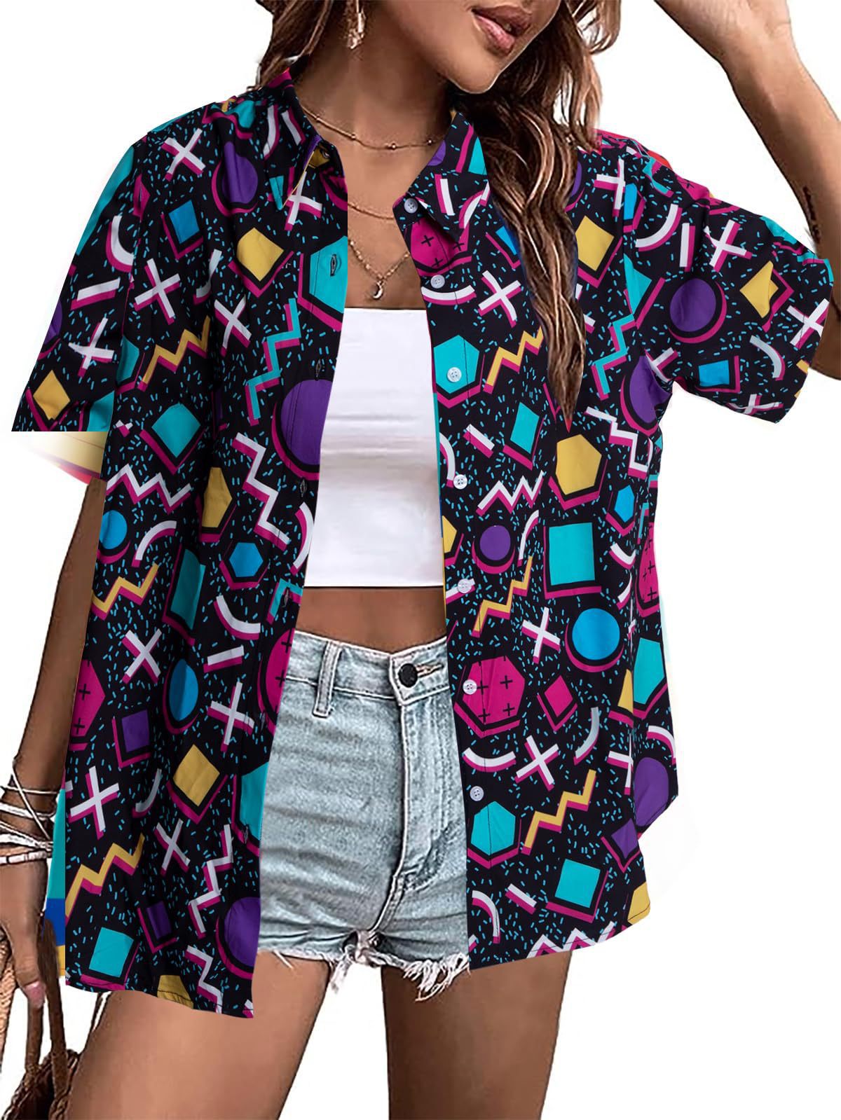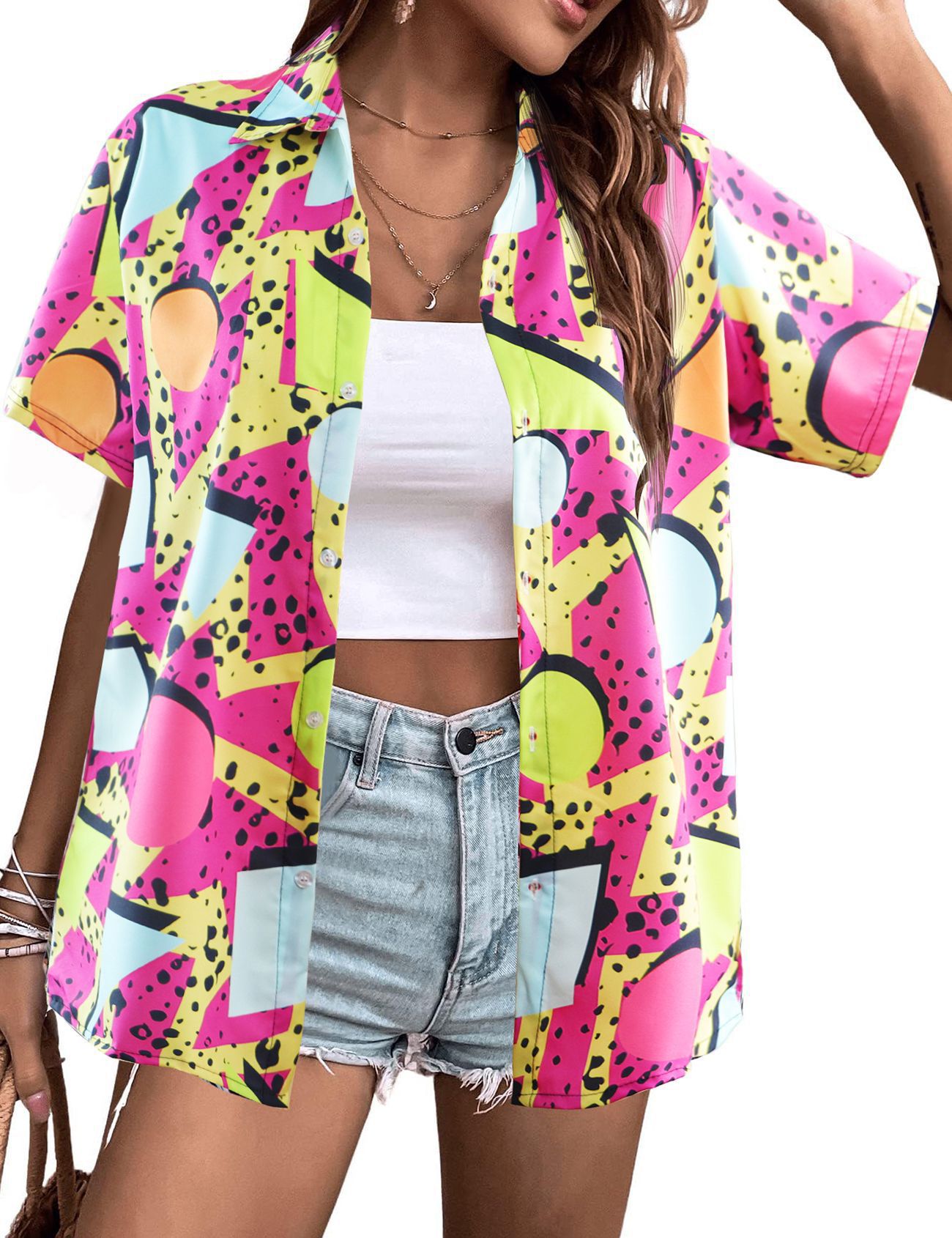 유럽과 미국 여성의 하와이 셔츠 캐주얼 짧은 소매 열대 꽃 3D 인쇄 여름 셔츠