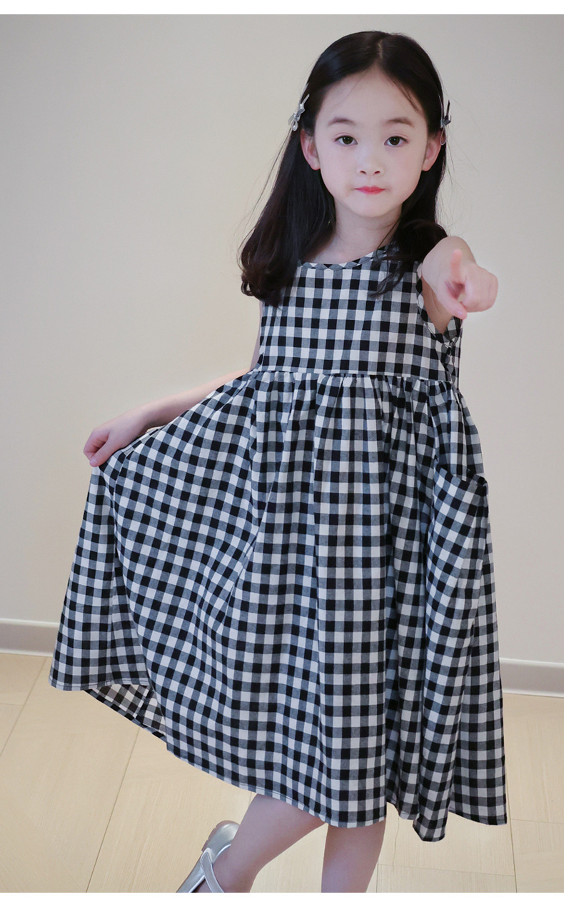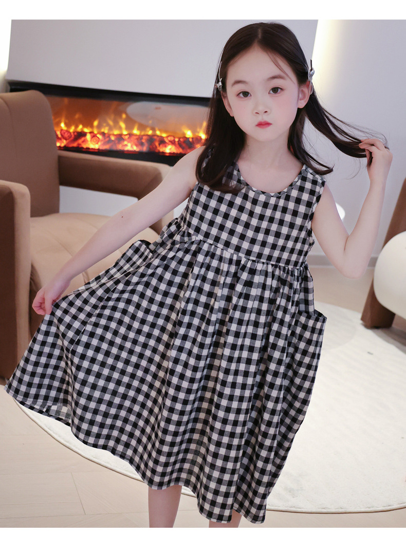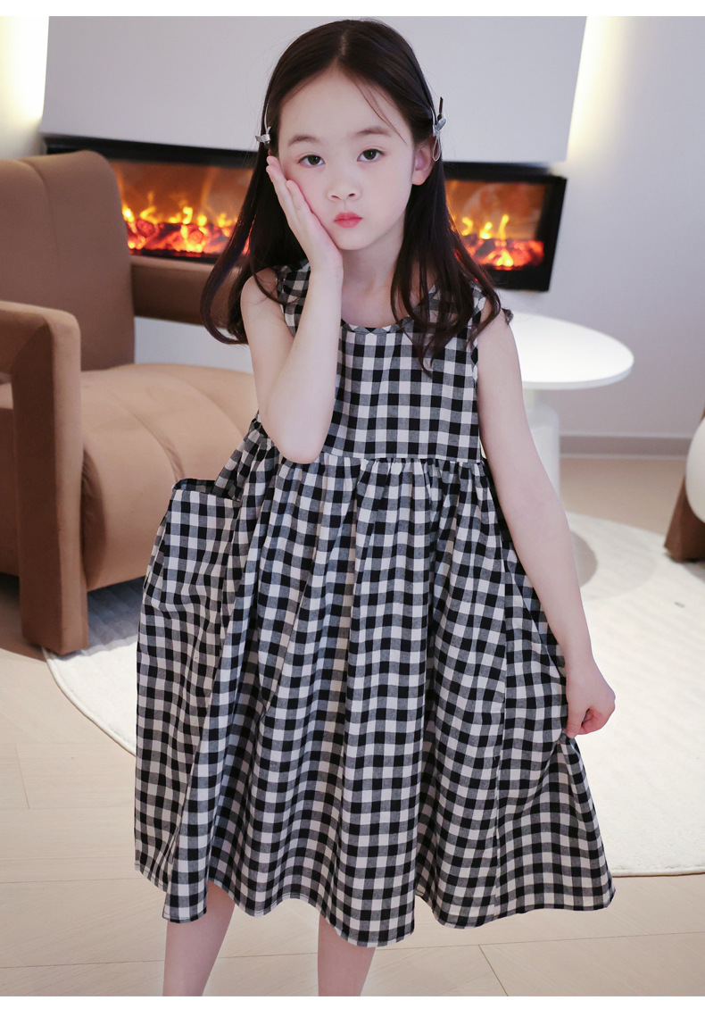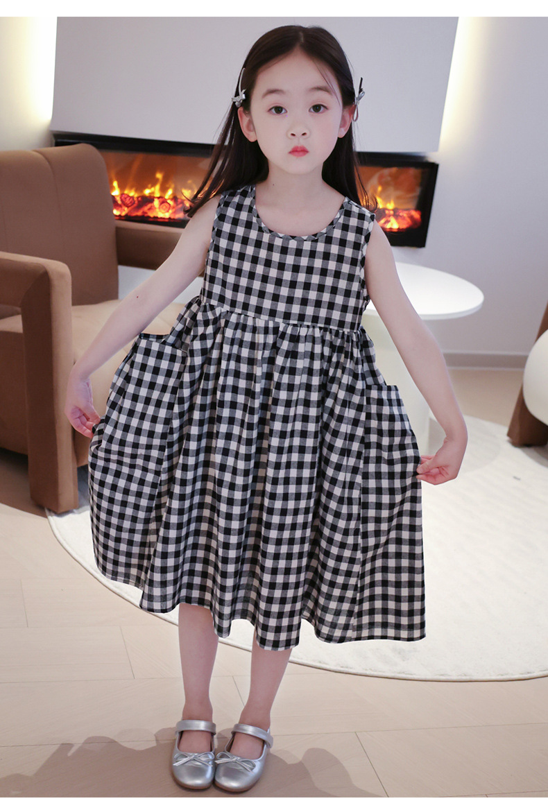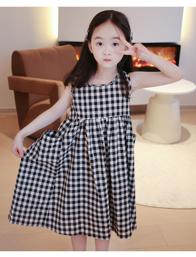 여름 소녀의 서양식 민소매 미디 원피스 2025 여름 새로운 어린이 격자 무늬 대형 포켓 원피스 대형 원피스스토어 가기