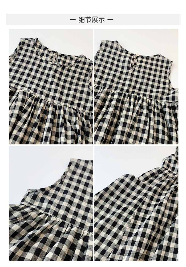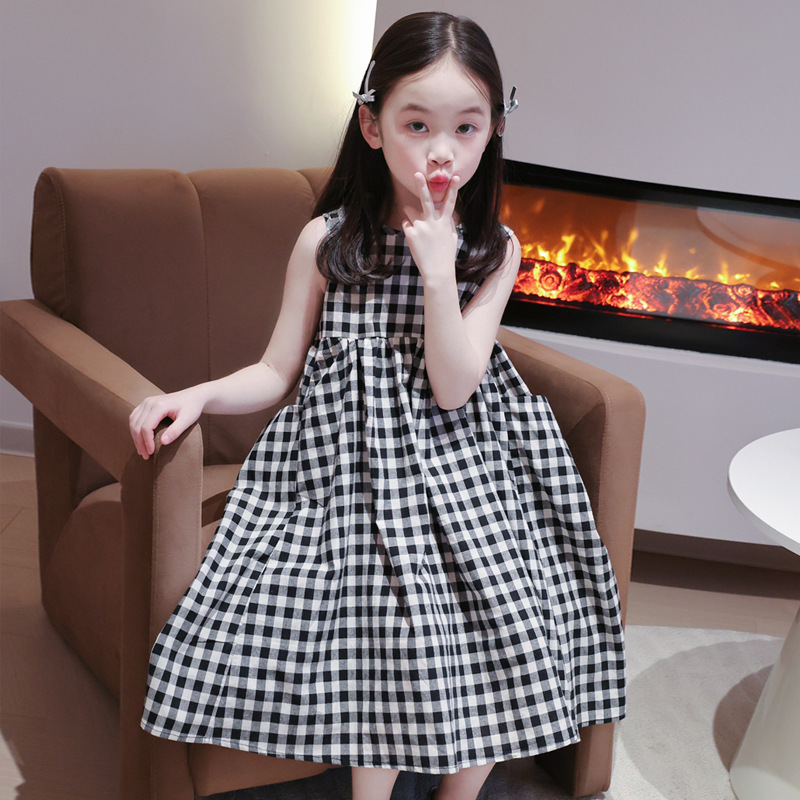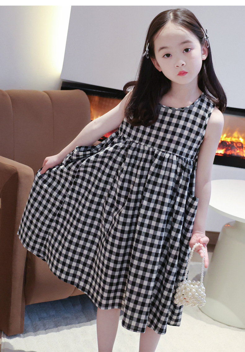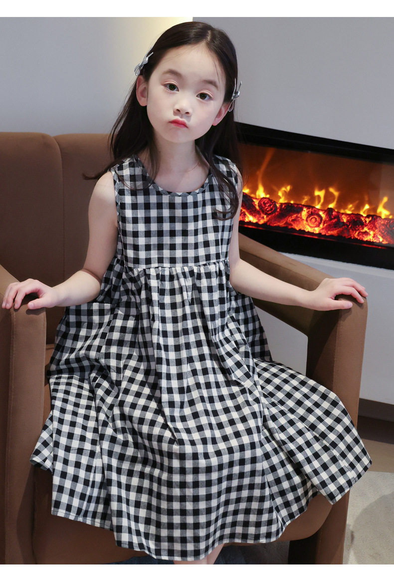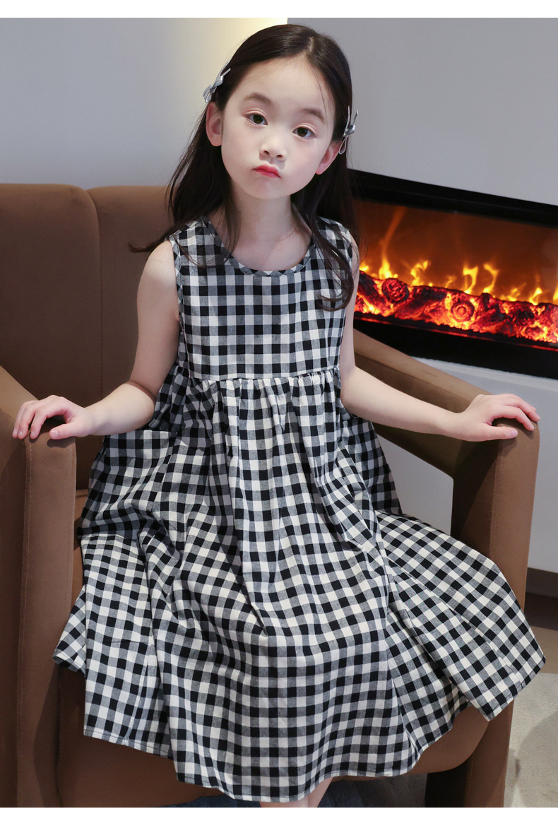 여름 소녀의 서양식 민소매 미디 원피스 2025 여름 새로운 어린이 격자 무늬 대형 포켓 원피스 대형 원피스스토어 가기
