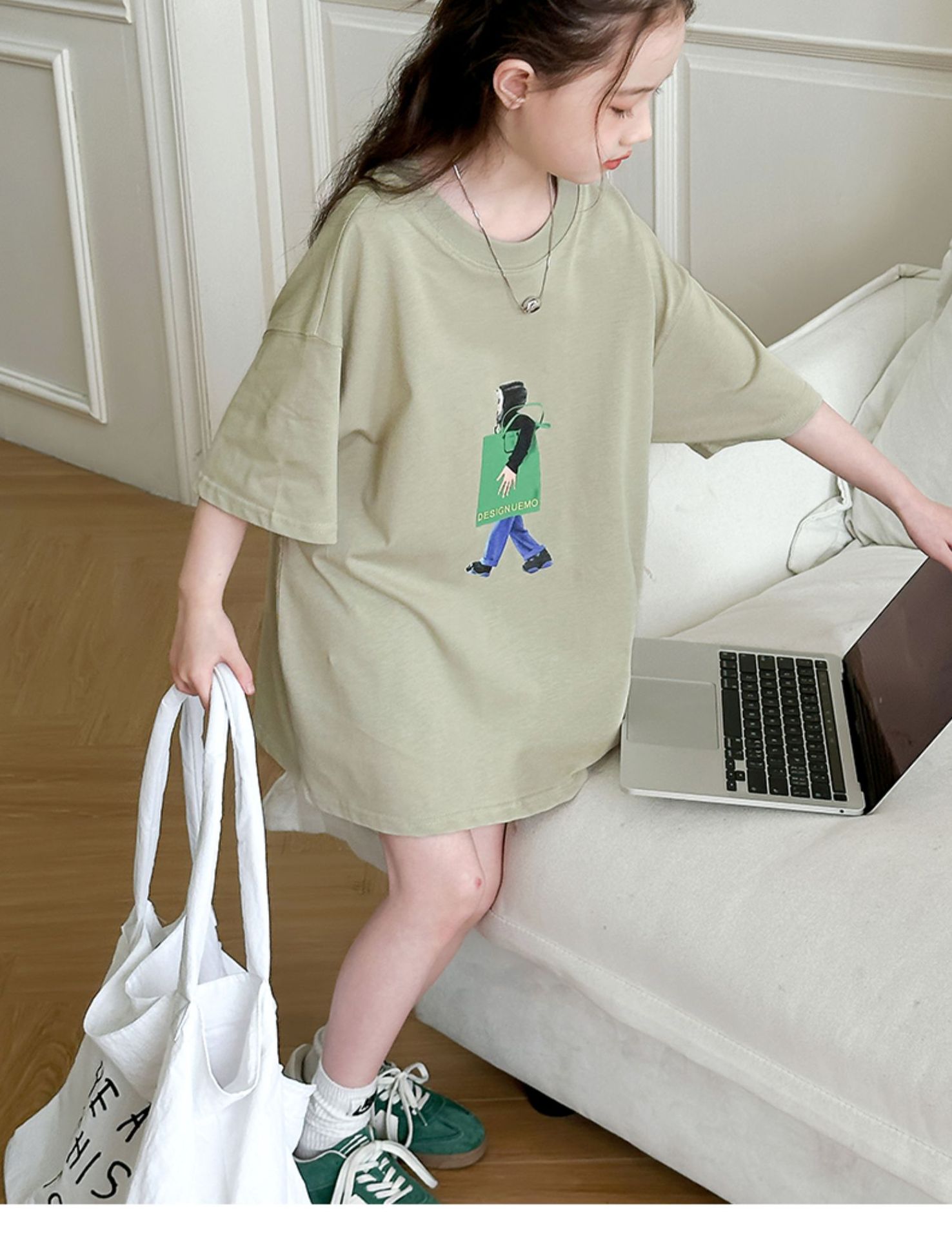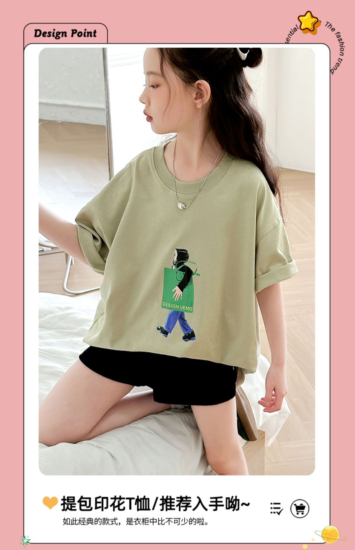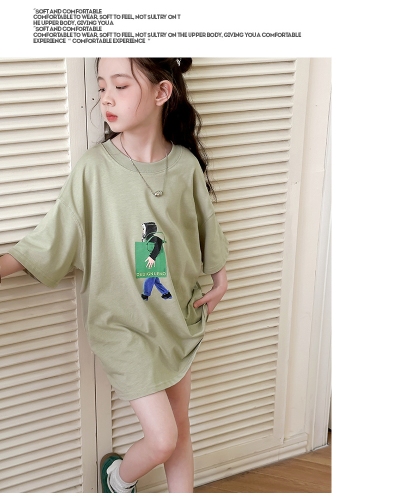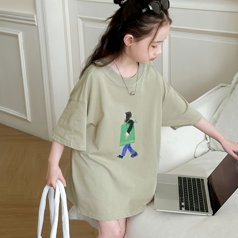 여자 반팔 티셔츠 유행 브랜드 여름 2025 새로운 스타일 어린이 소녀의 녹색 반소매 소녀의 빅 보이 슈퍼 니스 탑스토어 가기