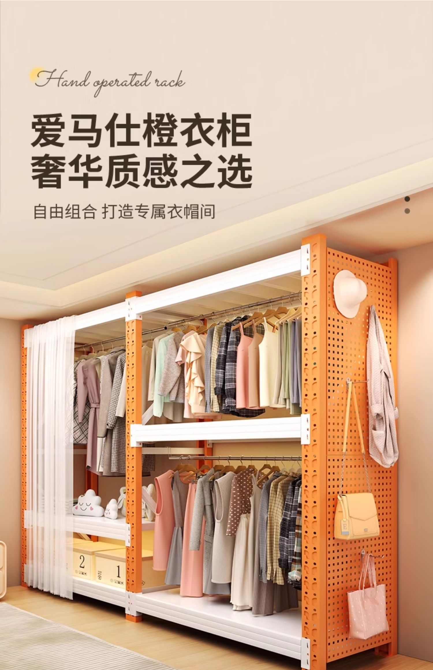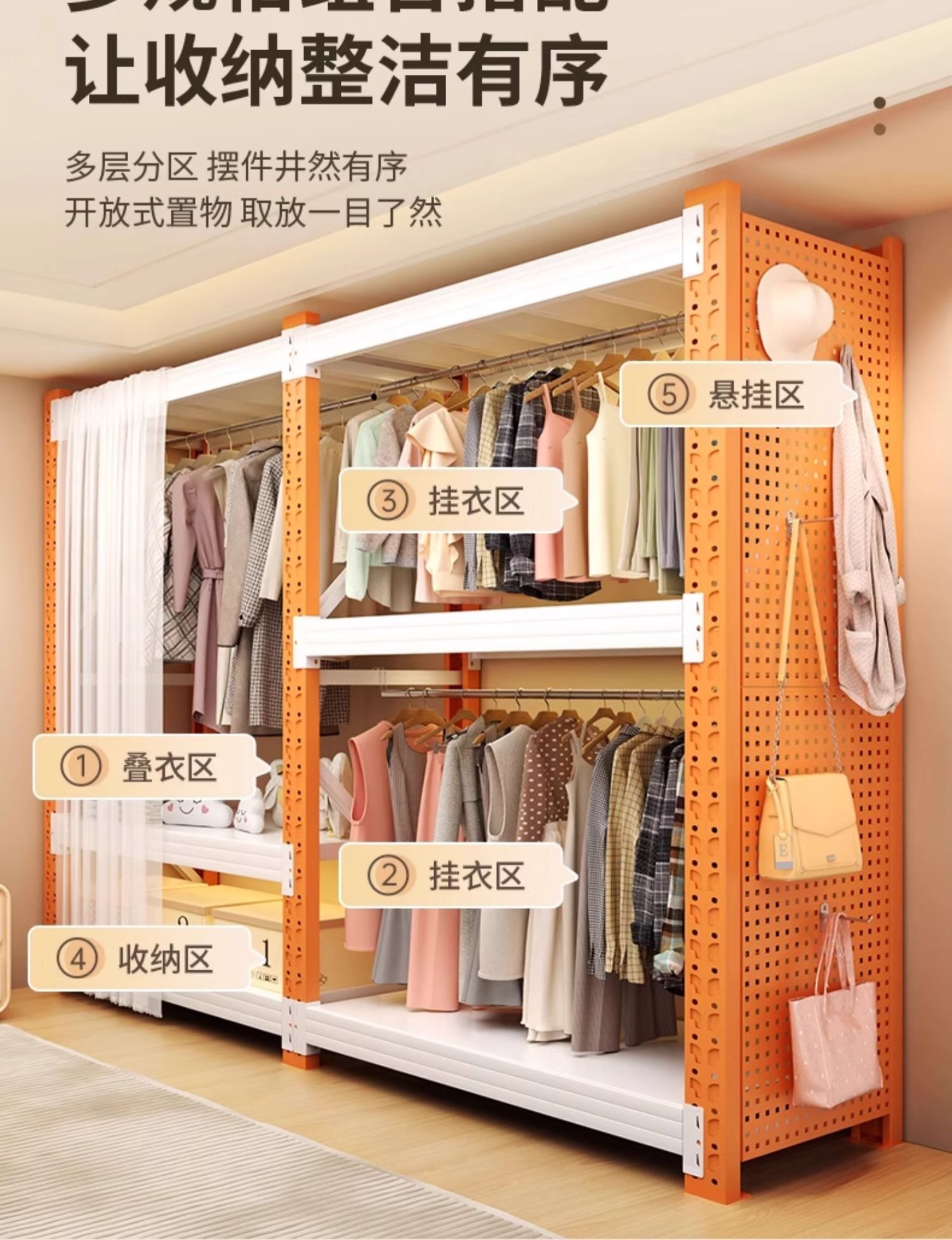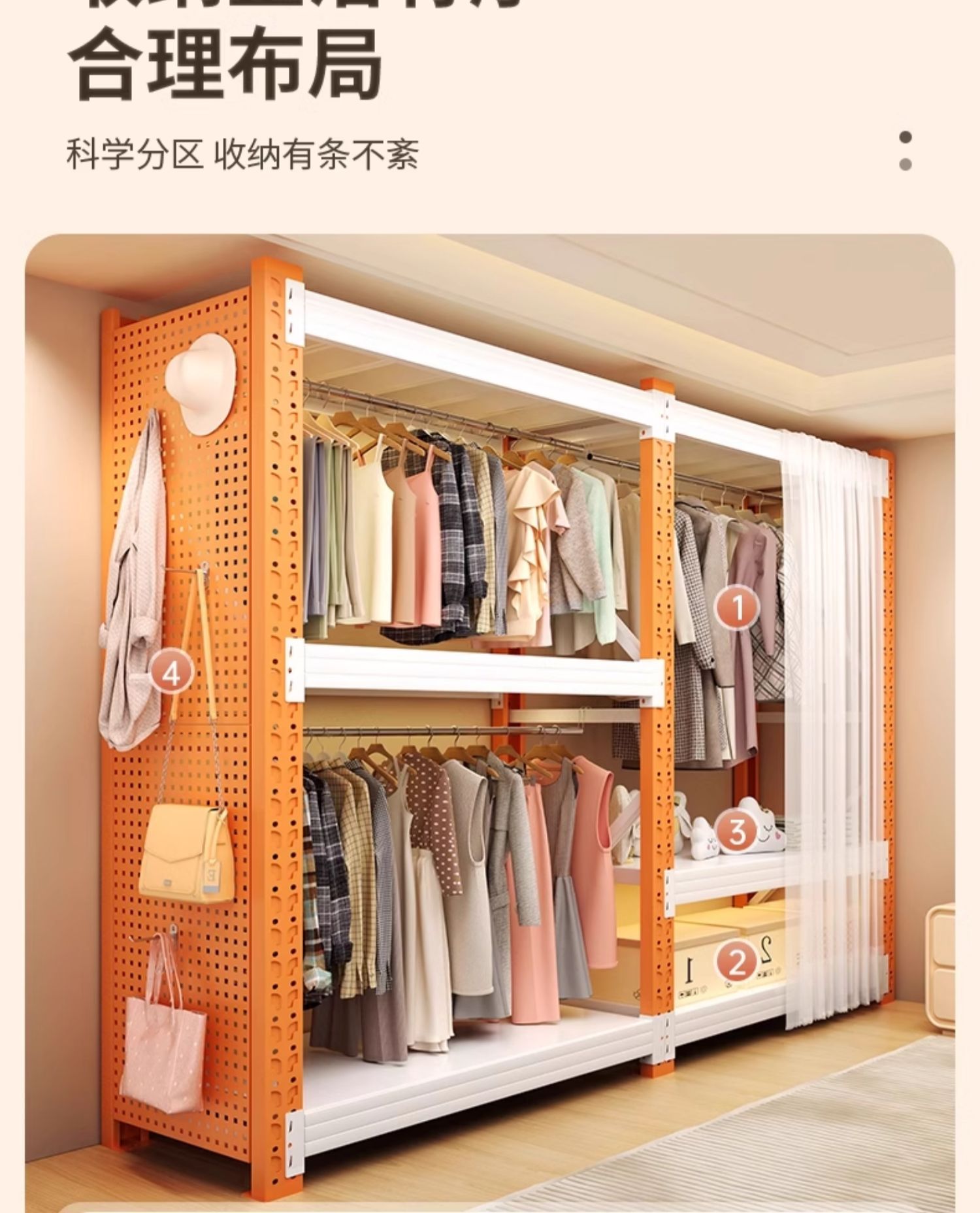 가정용 선반 옷걸이 간단한 조립 개방형 옷걸이 강철 저장 랙 먼지 커튼 다층 저장 선반