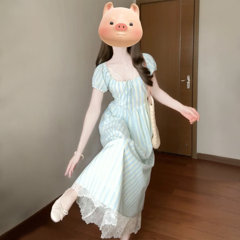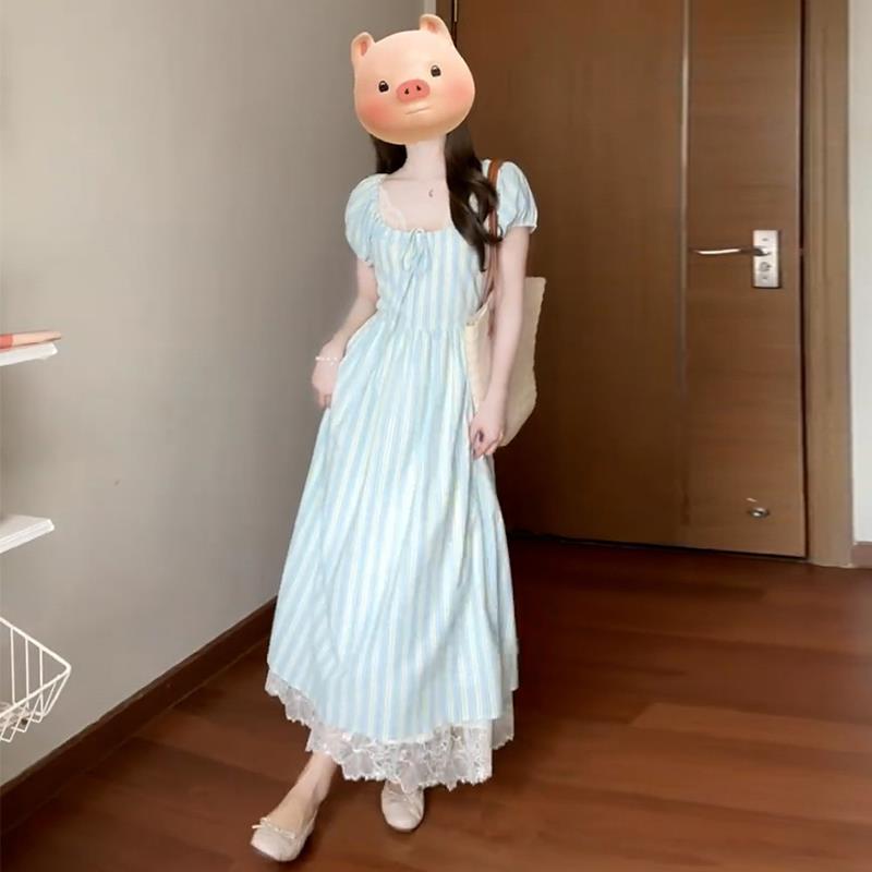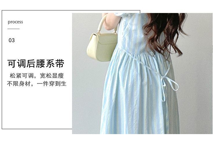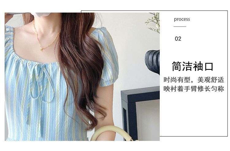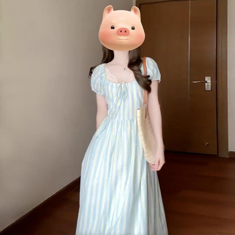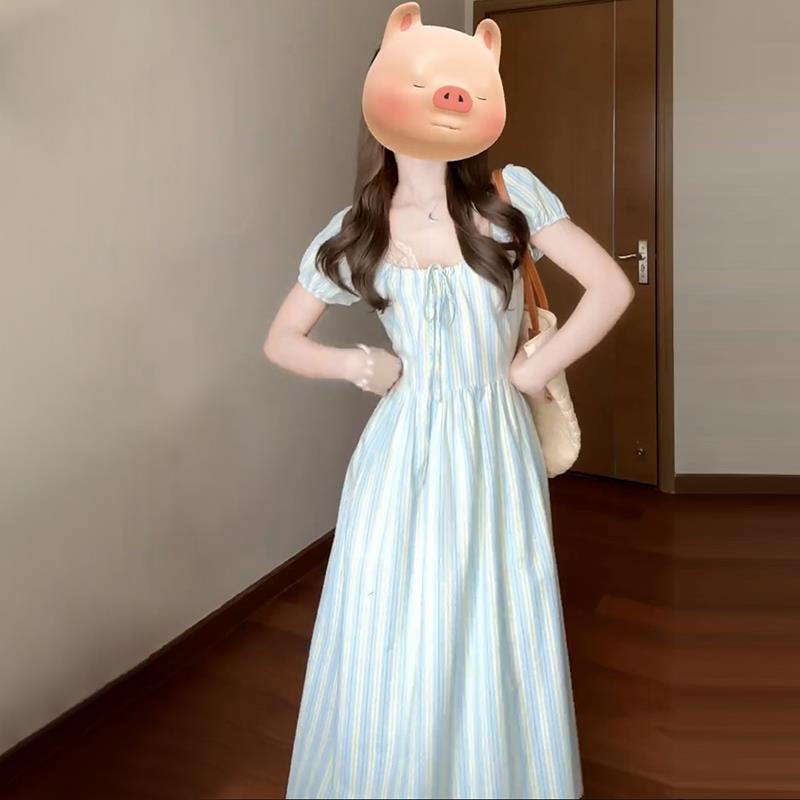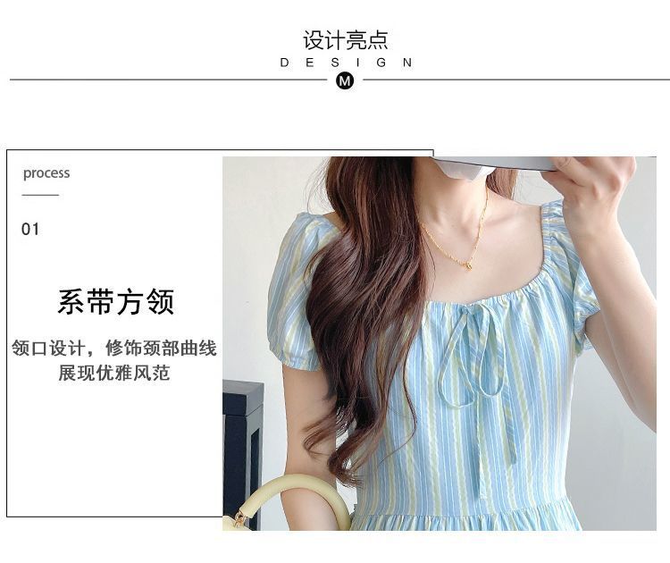 프랑스 스타일 차 브레이크 짧은 소매 서랍 디자인 센스 타이트 허리 슬리밍 우아한 패션 원피스 긴 줄무늬 치마스토어 가기