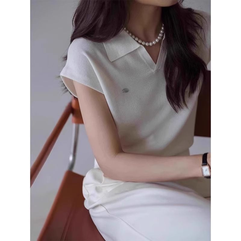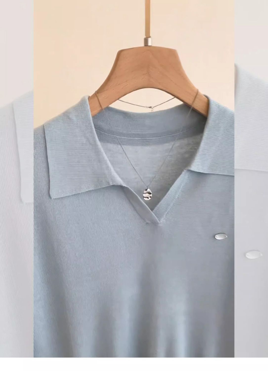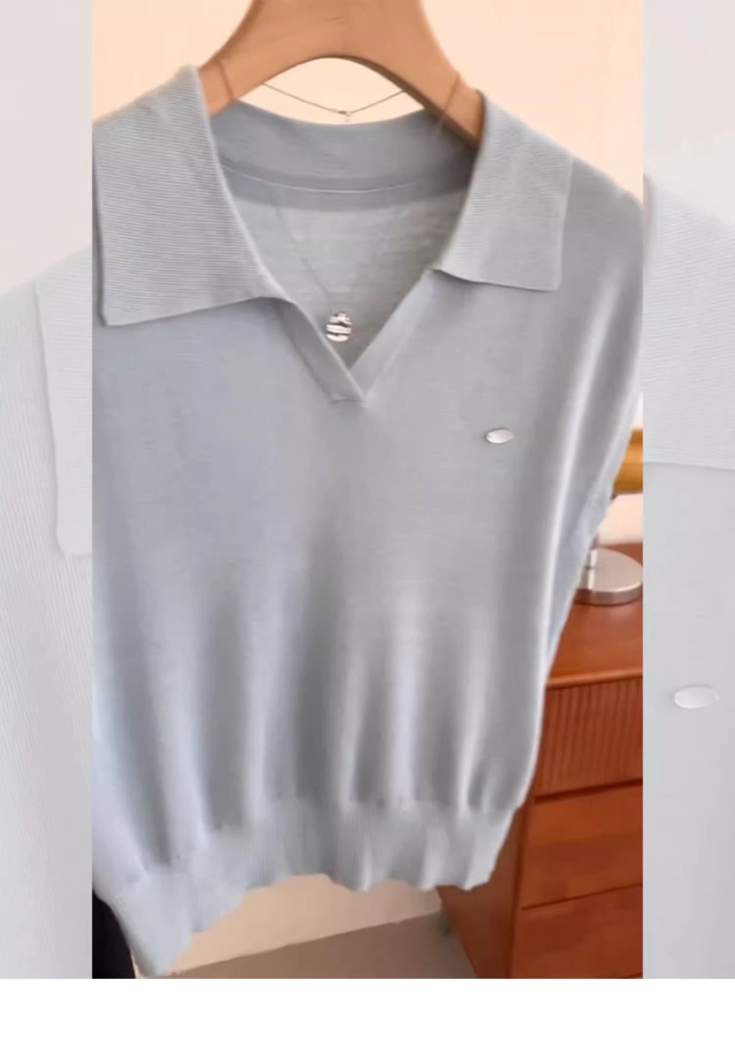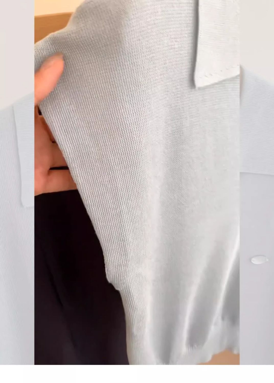 블루 V 넥 아이스 실크 폴로 셔츠 반팔 티셔츠 작은 슬림핏 타이트 허리 짧은 니트 랩 칼라 탑 여성 여름스토어 가기