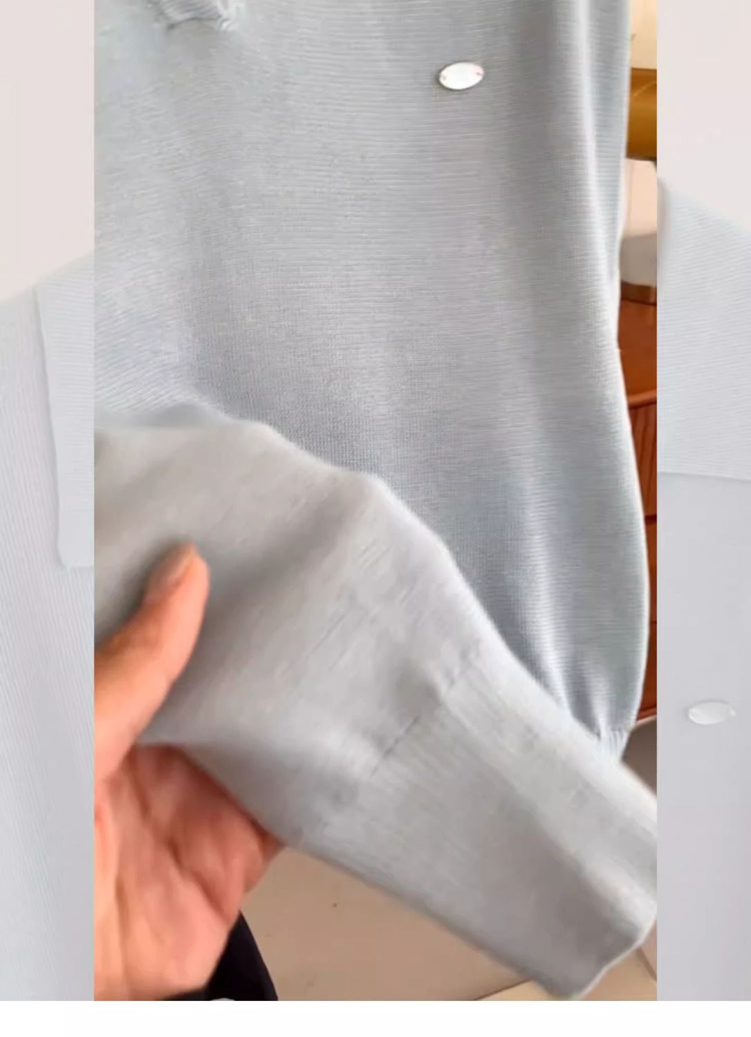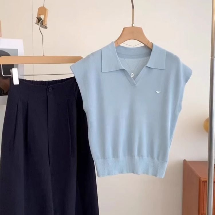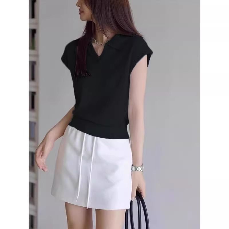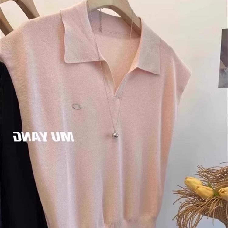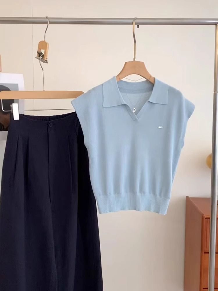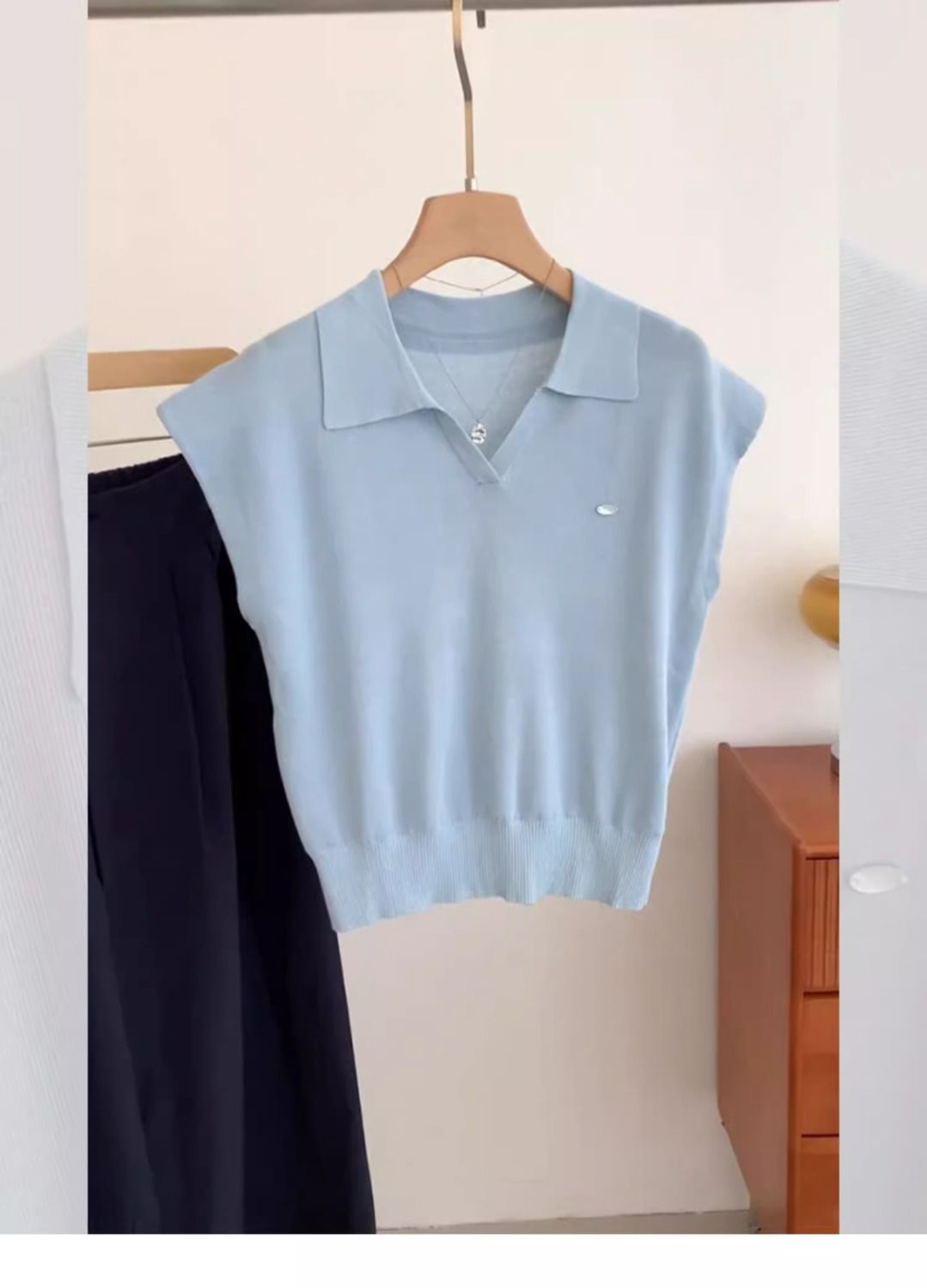 블루 V 넥 아이스 실크 폴로 셔츠 반팔 티셔츠 작은 슬림핏 타이트 허리 짧은 니트 랩 칼라 탑 여성 여름스토어 가기