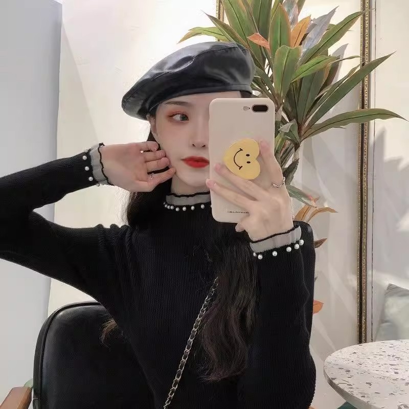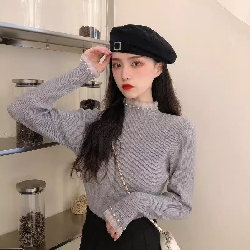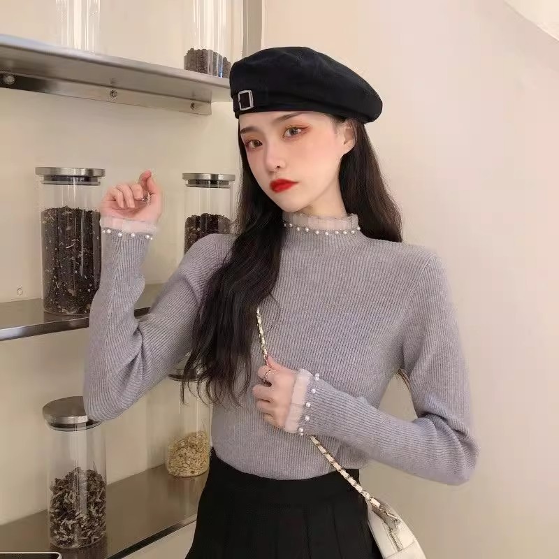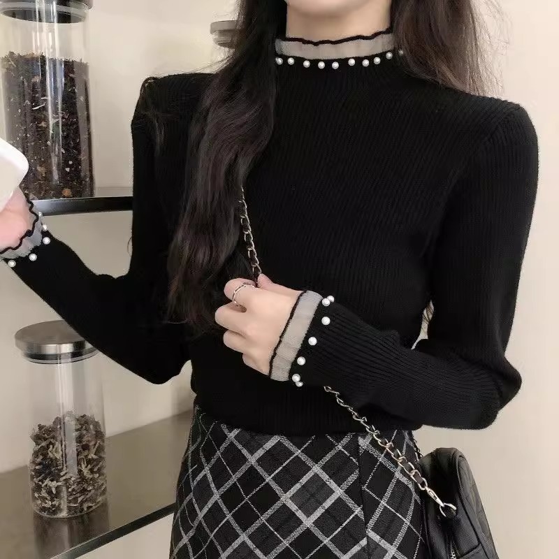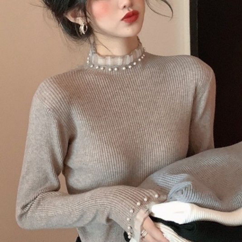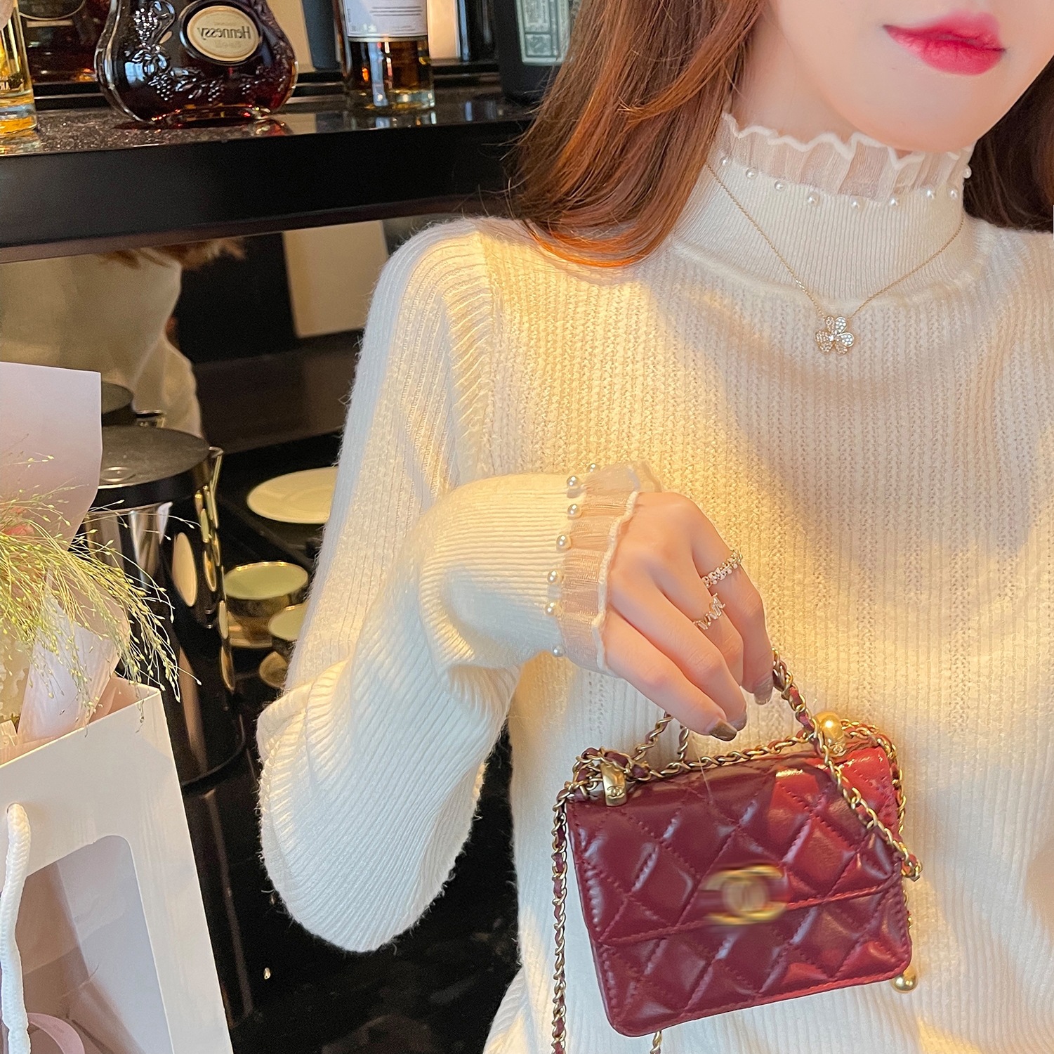 샤넬 스타일 반 높이 칼라 내베이스 셔츠 여성의 겨울 봄과 가을 새로운 진주 스웨터 2025 레이스 니트 탑스토어 가기