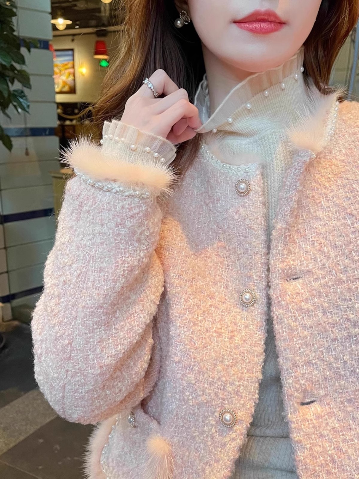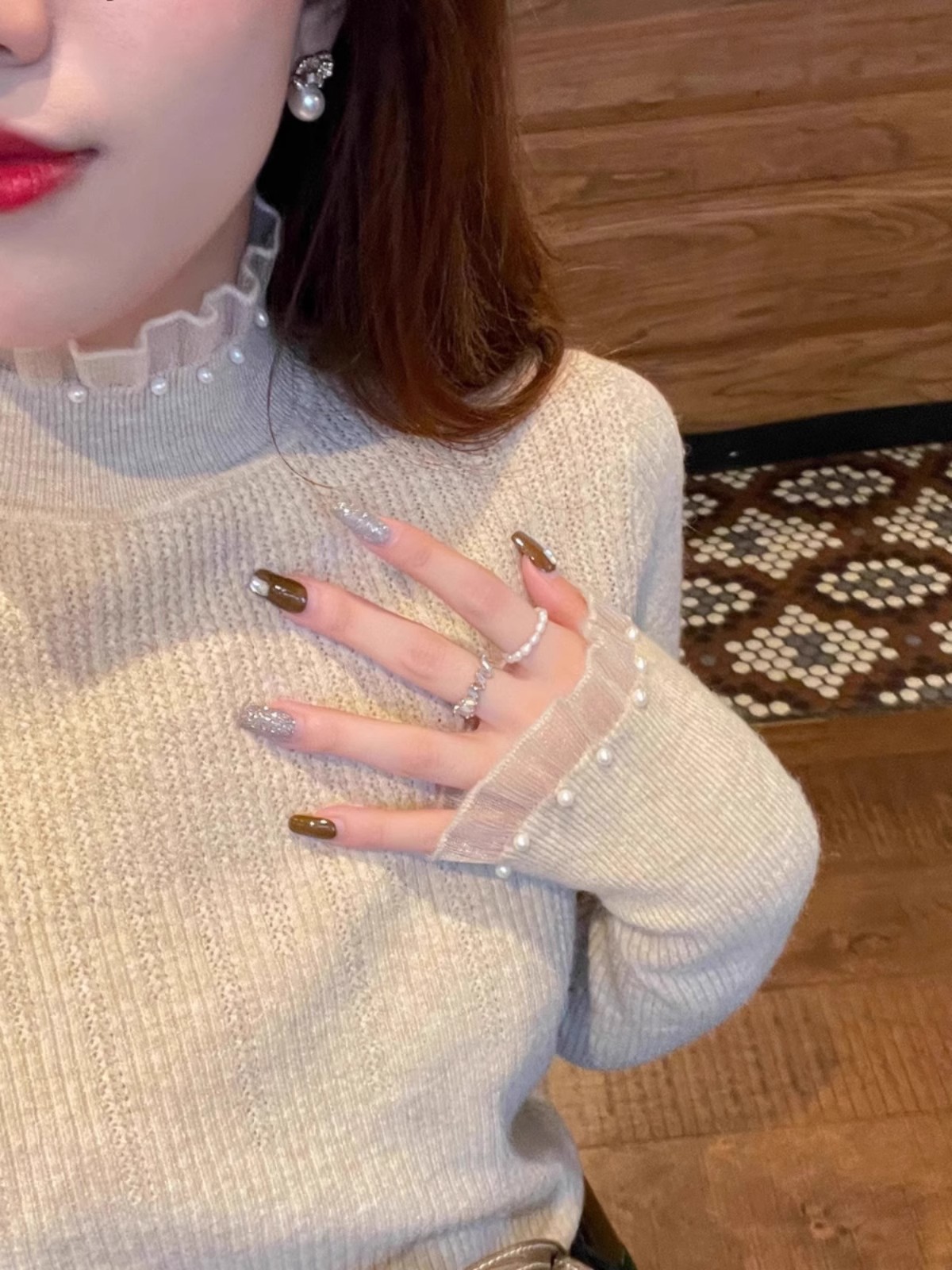 샤넬 스타일 반 높이 칼라 내베이스 셔츠 여성의 겨울 봄과 가을 새로운 진주 스웨터 2025 레이스 니트 탑