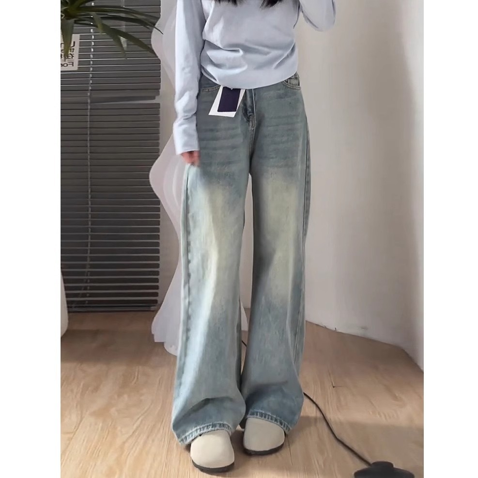 밝은 색 넓은 다리 청바지 여성의 높은 허리 봄 새 플러스 사이즈 통통녀 느슨한 슬리밍 배 모양 스트레이트 바지스토어 가기