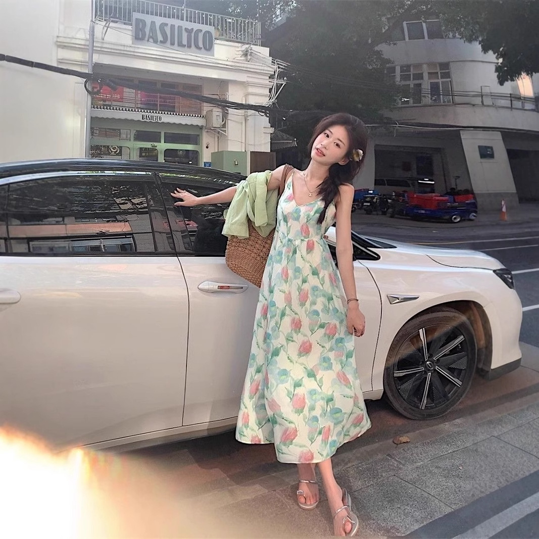 여름 튤립 홀리데이 스타일 슬립 스커트 여름 올 매치 스위트 싱 V 넥 슬립 스커트 스위트 비치 롱 스커트스토어 가기