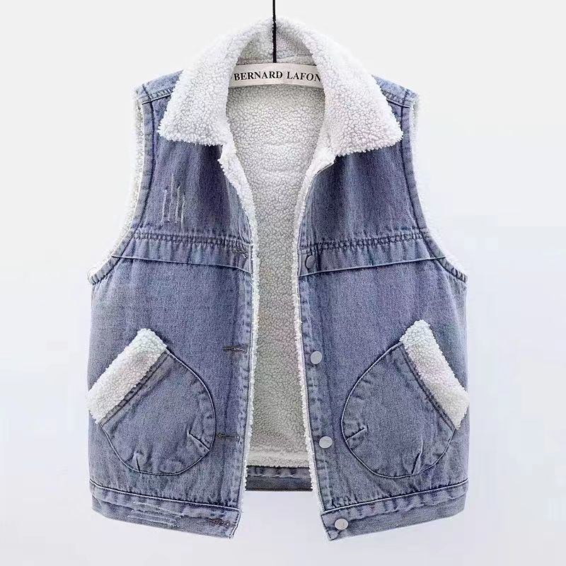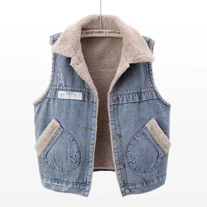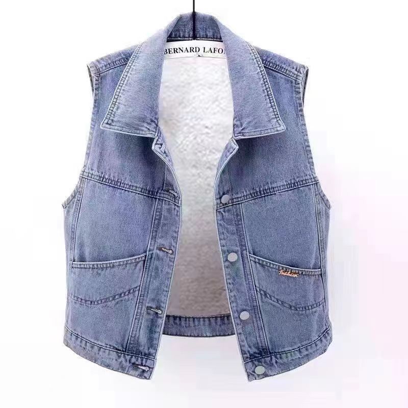 가을과 겨울 양모 기모 두꺼운 데님 조끼 여성용 느슨한 짧은 소매 조끼 어깨 조끼 재킷스토어 가기