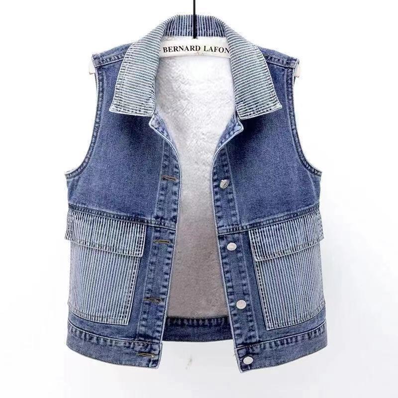 가을과 겨울 양모 기모 두꺼운 데님 조끼 여성용 느슨한 짧은 소매 조끼 어깨 조끼 재킷
