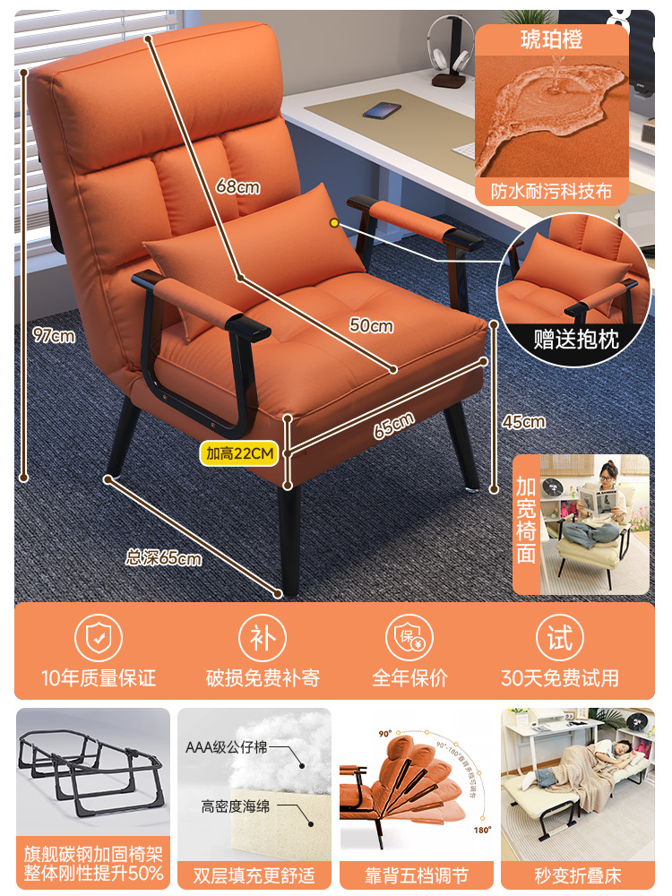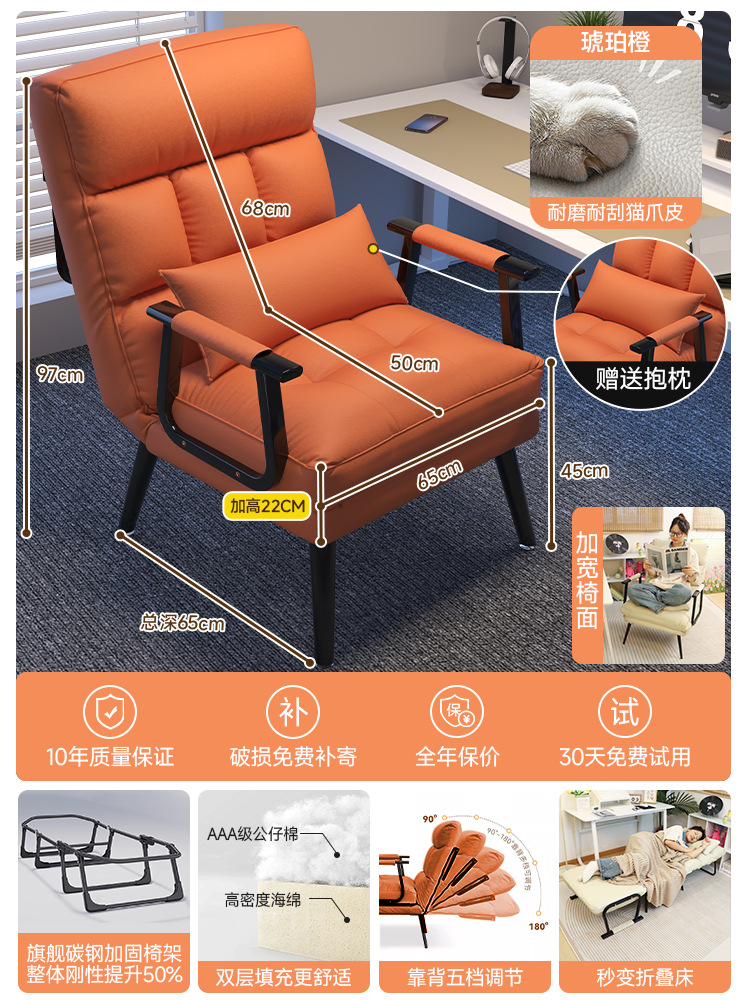 • 업그레이드되고 안정적이며 흔들리지 않음 [두꺼워진 이중 충전재] 22CM 증가 - 호박색 주황색 - 기술 천 등받이 5단계 조절