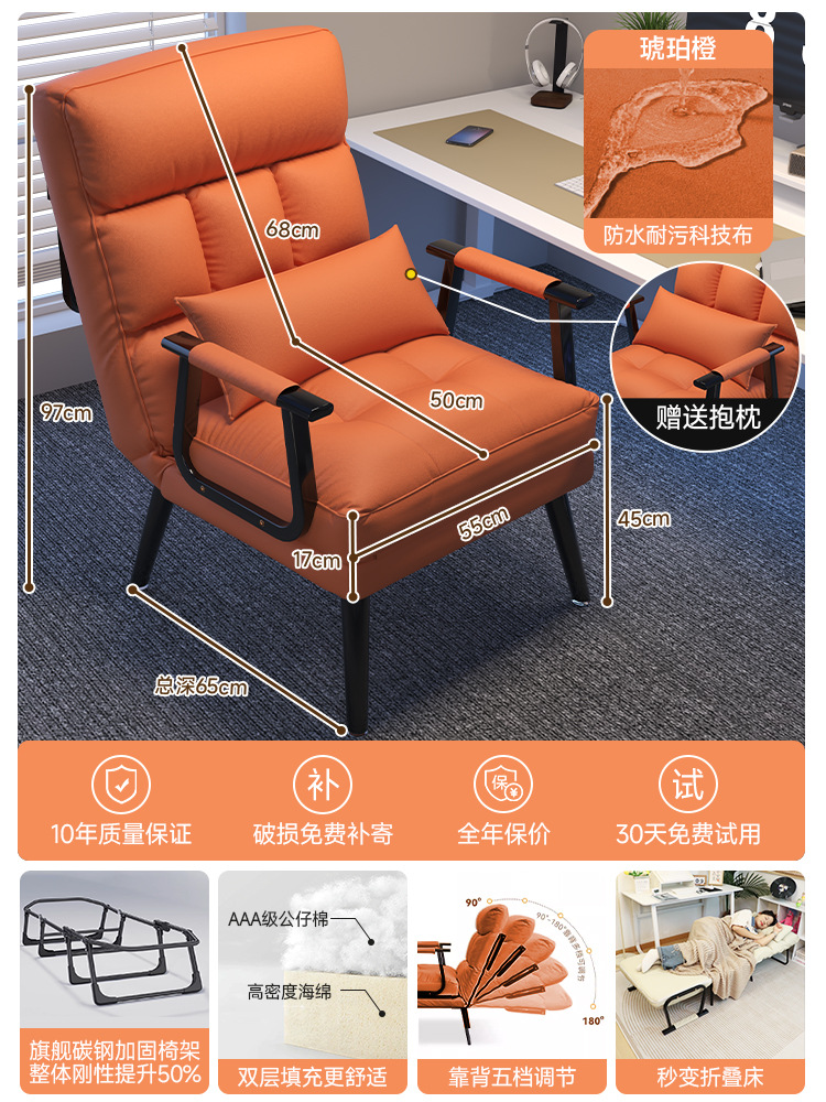 • 업그레이드되고 안정적이며 흔들리지 않는 [두꺼운 이중 충전재] 호박색 주황색 기술 천 등받이 5단계 조절 가능
