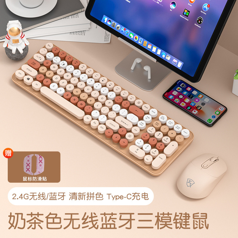 • [블루투스 버전 105키] 밀크티 컬러 무선 블루투스 키보드 + 무선 블루투스 마우스 + 미끄럼 방지 스티커 [듀얼 모드 무선 + 블루투스]