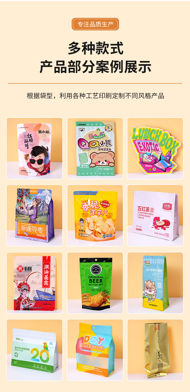식품 포장 가방 맞춤형 인쇄 가능한 로고 플라스틱 가방 말린 과일 스낵 차 8 면 자체 밀봉 가방 진공 가방 맞춤형