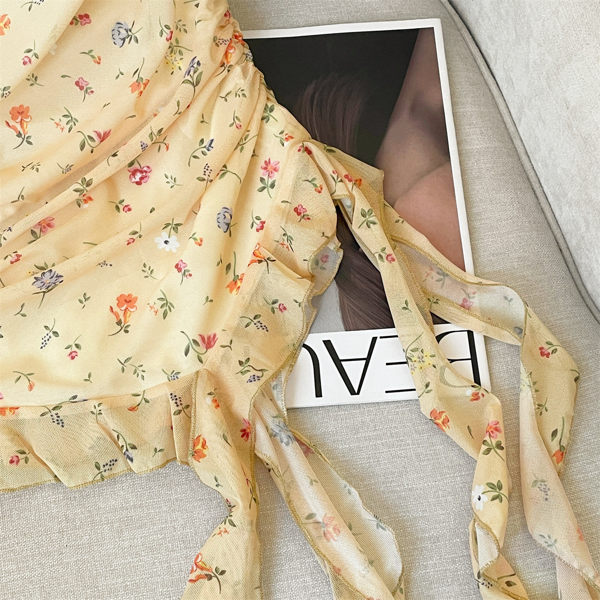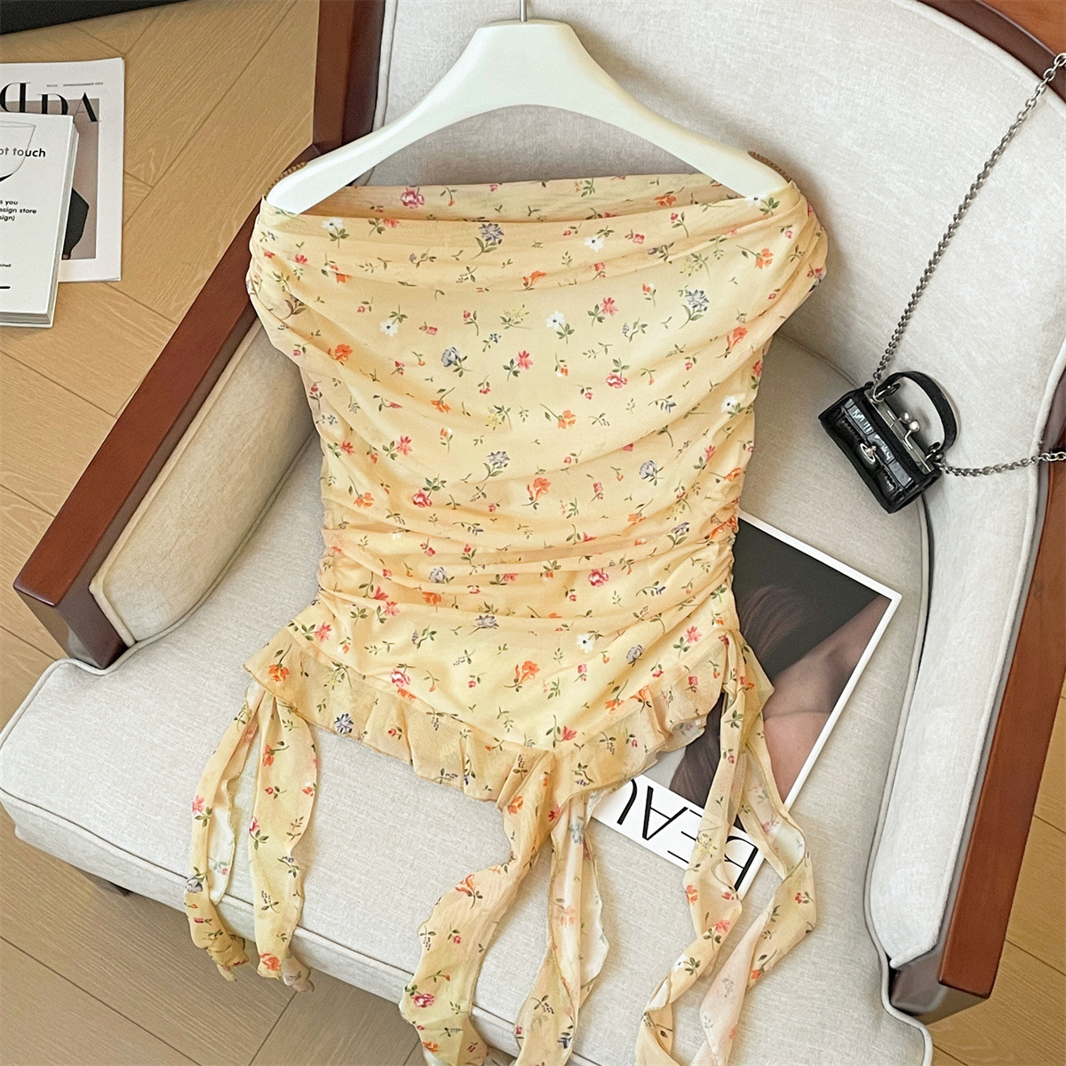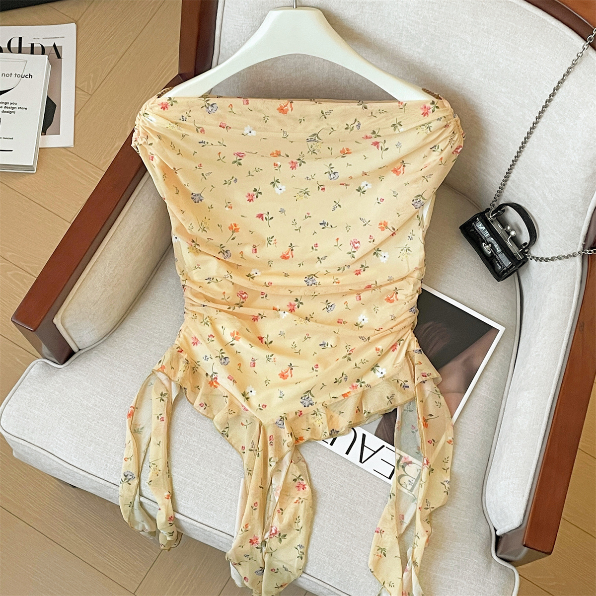实拍夏季新款名媛外穿显瘦雪纺衫高级感不规则飘带碎花纯欲上衣女