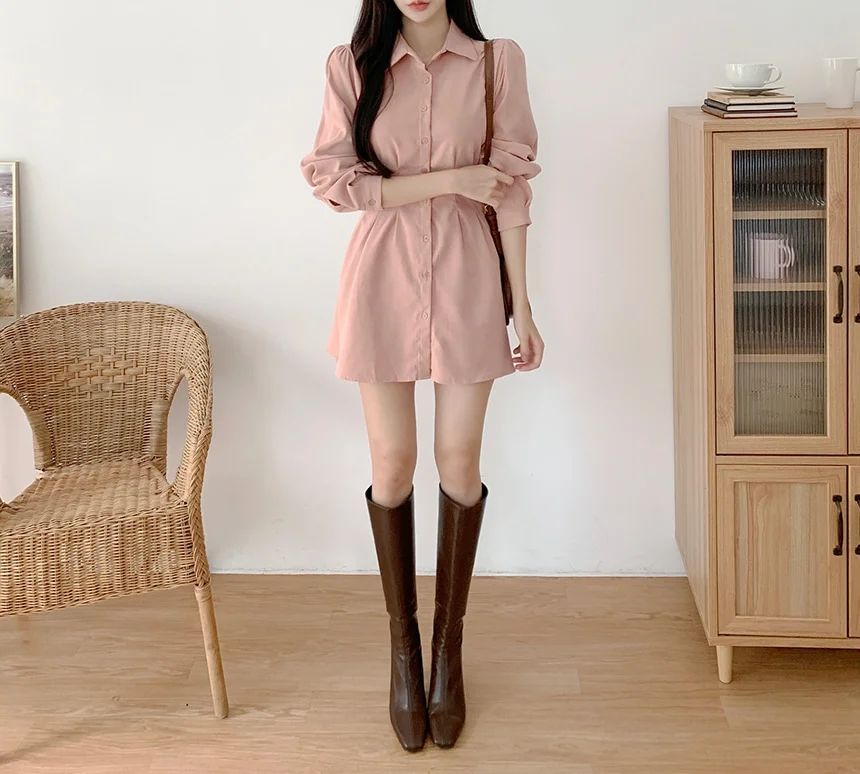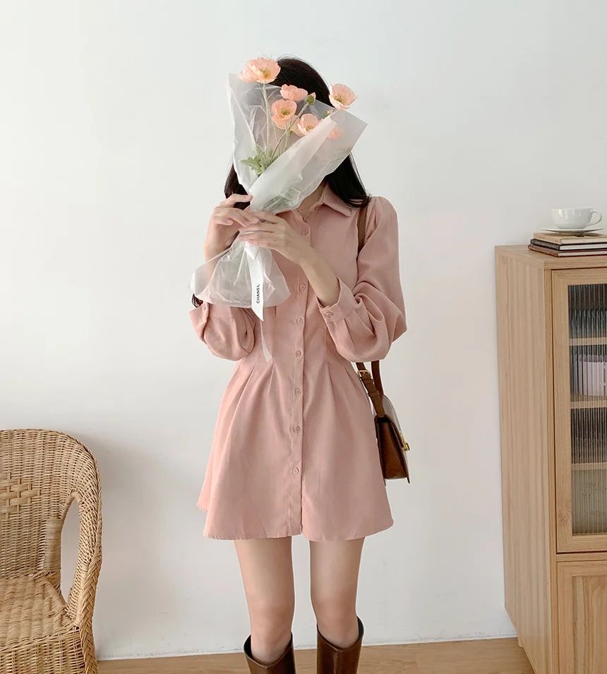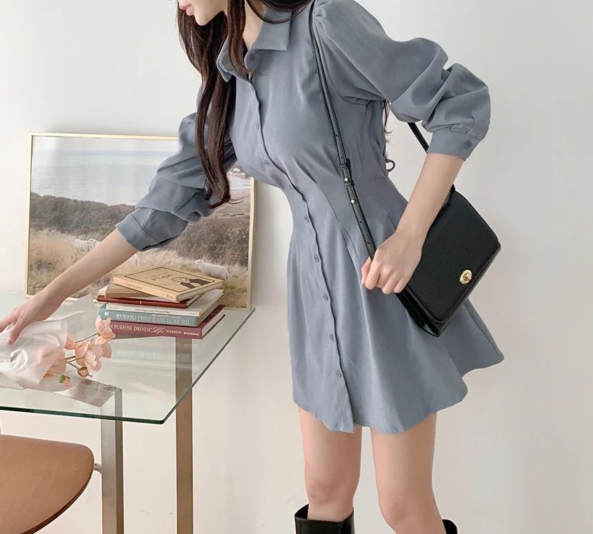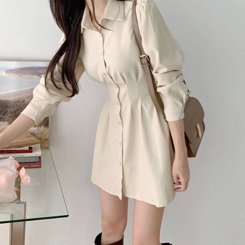 2025 프랑스 허리 슬림 셔츠 원피스 여성의 봄과 가을 긴 소매 외부 착용 작은 A-셔츠베이스 원피스스토어 가기