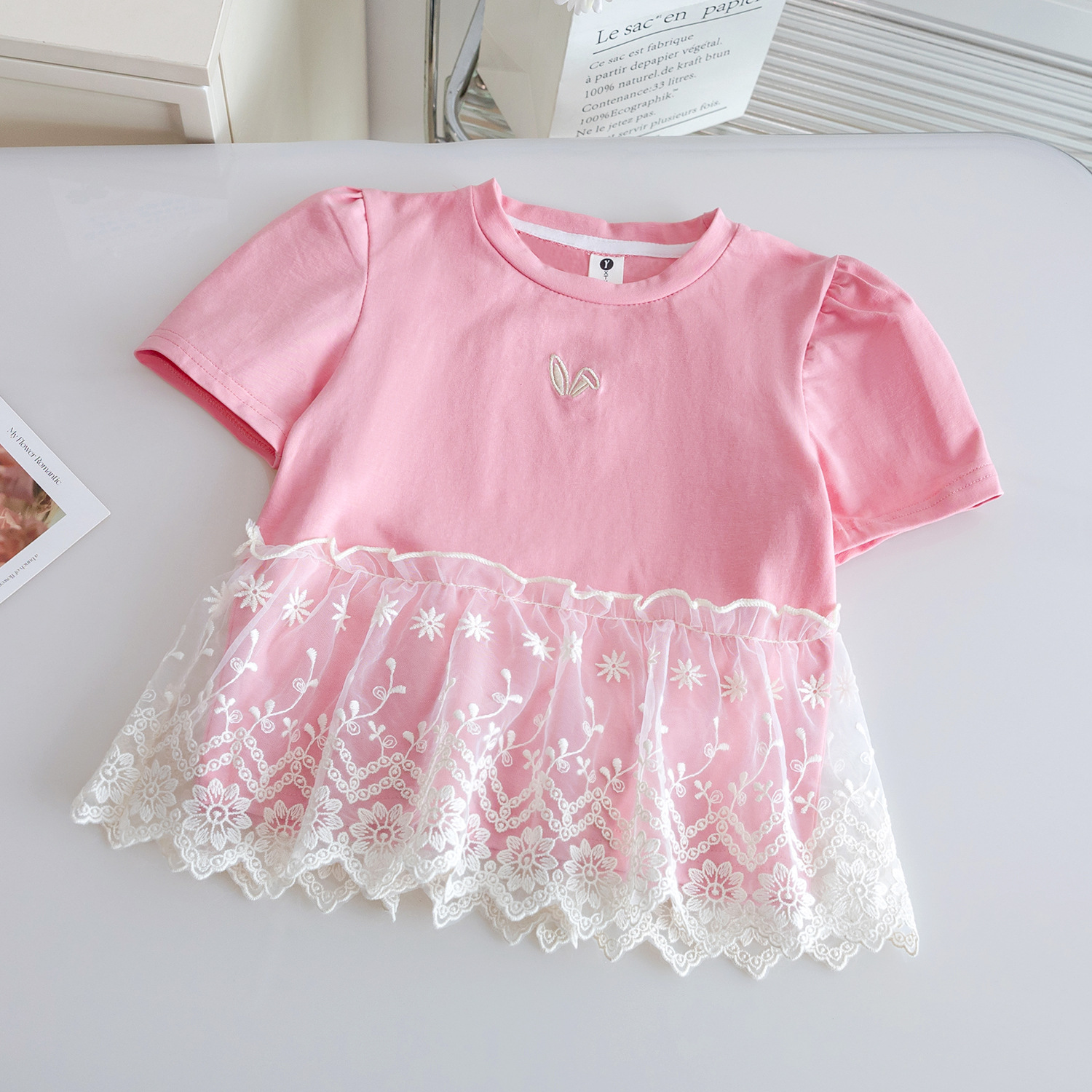 여자 귀여운 여름 서양식 둥근 목 짧은 소매 티셔츠 여성용 보물 25 새로운 레이스 레이스 만화 최고 어린이 3