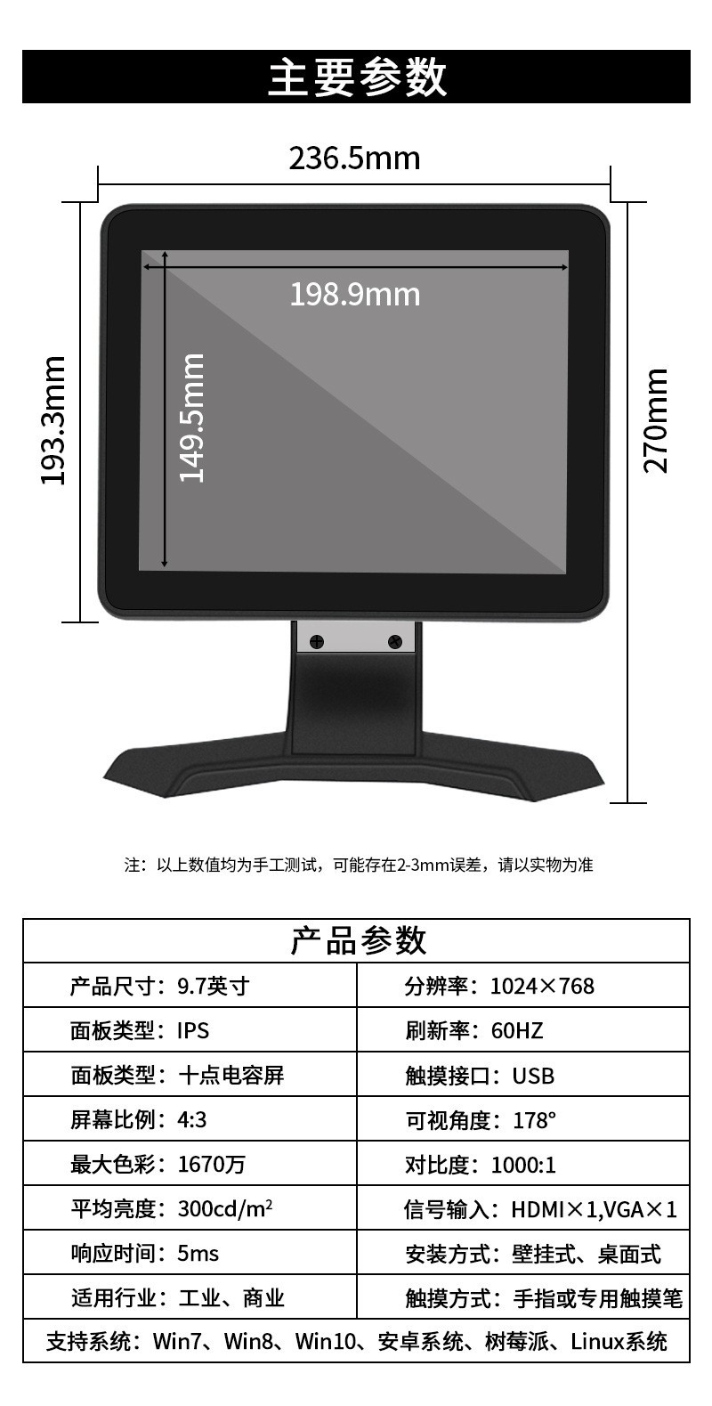 맞춤형 9.7inch 포지티브 스크린 용량 성 터치 스크린 모니터 넓은 온도 범위 벽걸이 형 멀티 터치 접이식 캐셔 디스플레이스토어 가기