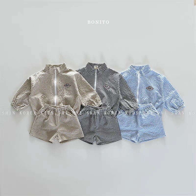 여름용 어린이 체크무늬 스탠드 칼라 재킷 반바지 세트 트렌디한 투피스 얇은 체크무늬 지퍼 자외선 차단 의류 세트스토어 가기