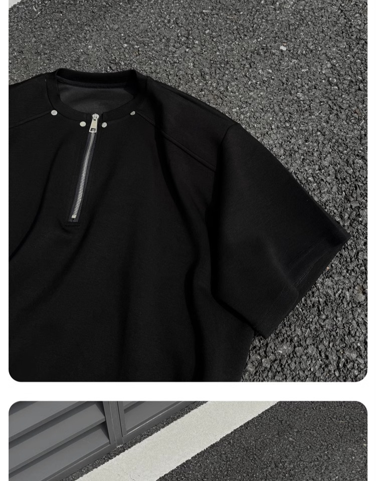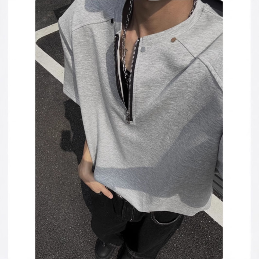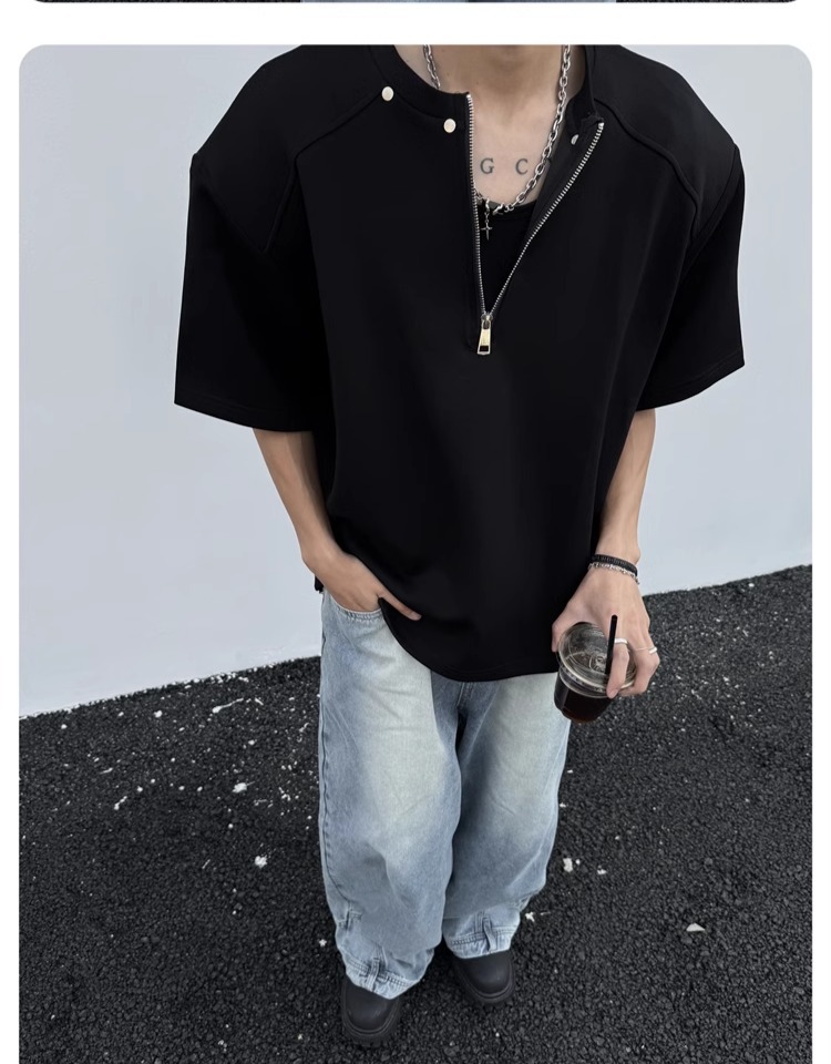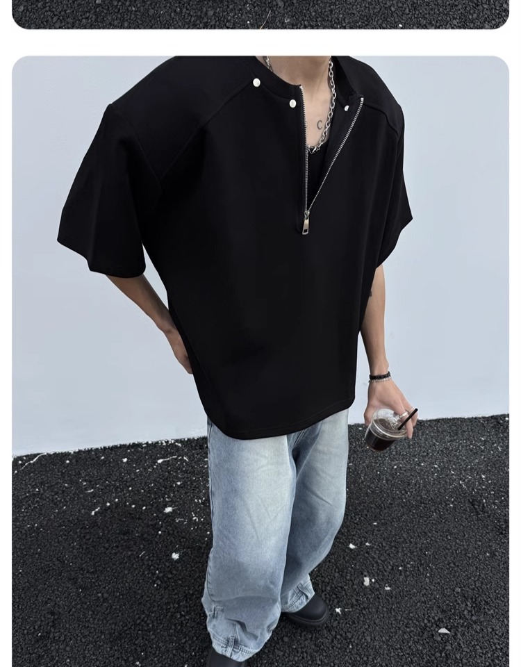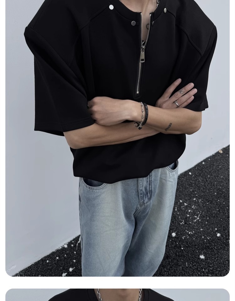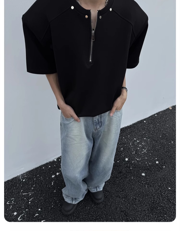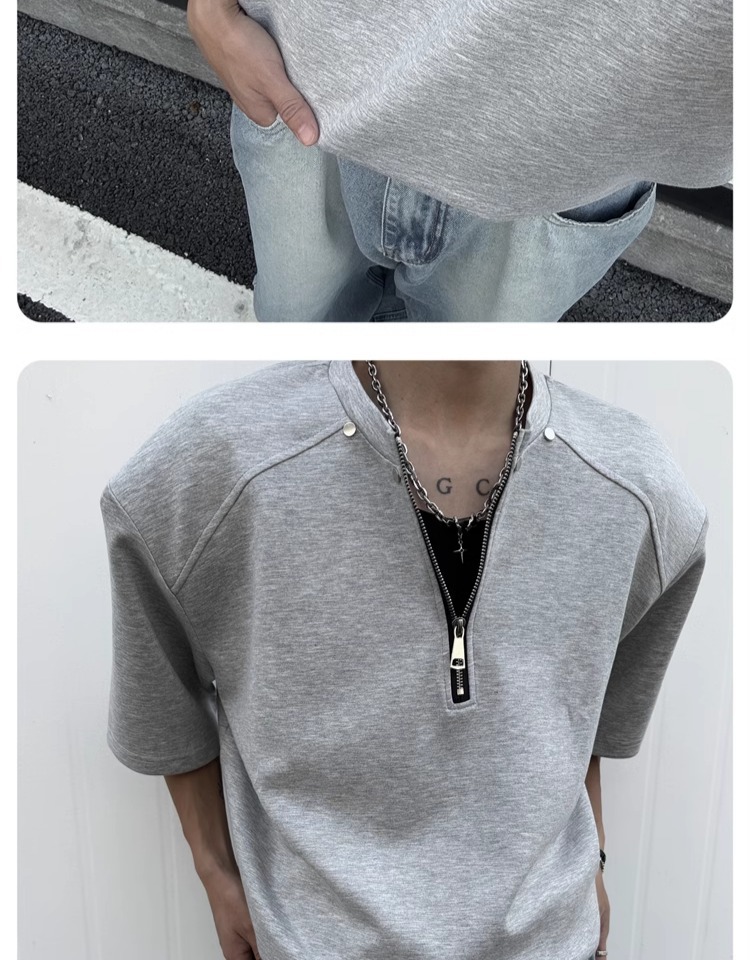 고급 하프 지퍼 어깨 패드 티셔츠 남성용 클렌핏 헤비 쇼트 슬리브 아메리칸 스타일 하이 스트리트 리벳 디자인 하프 슬리브
