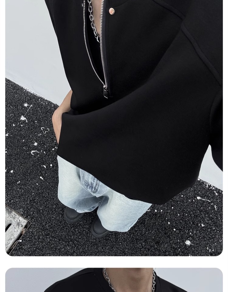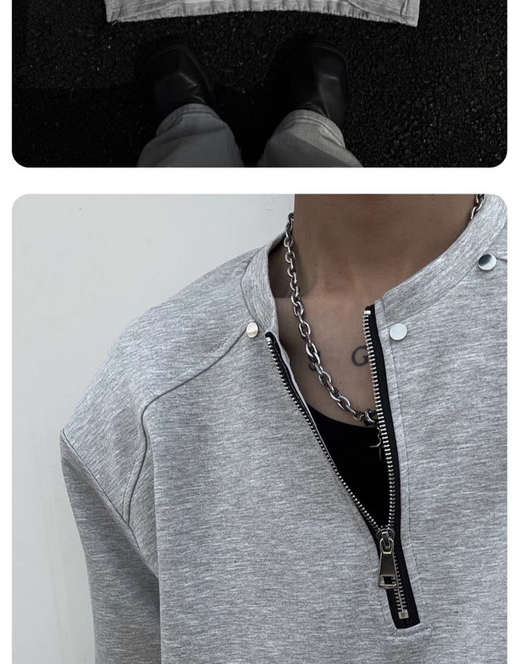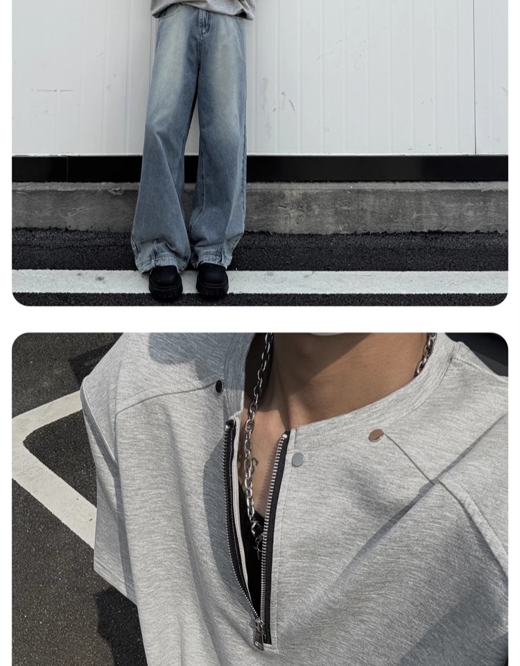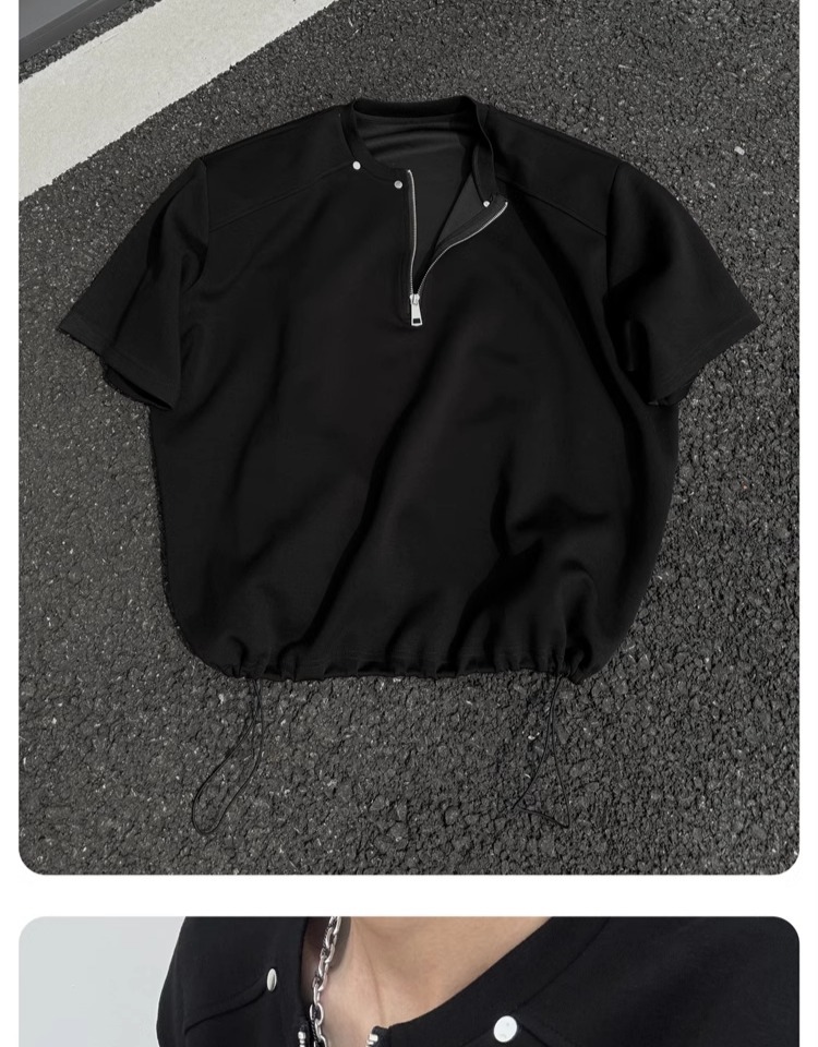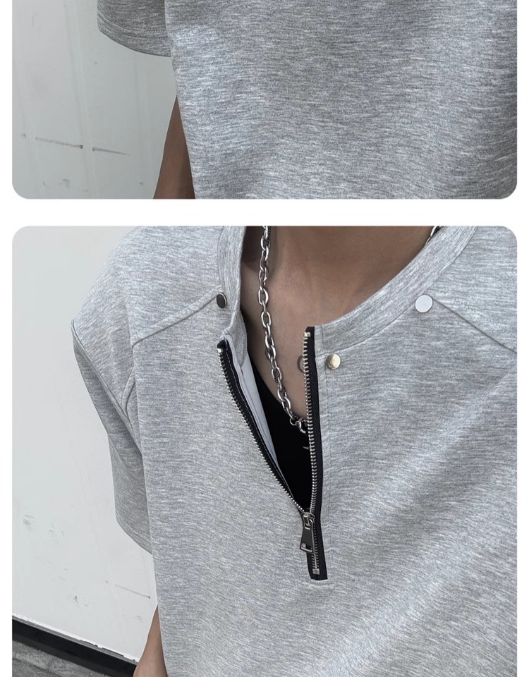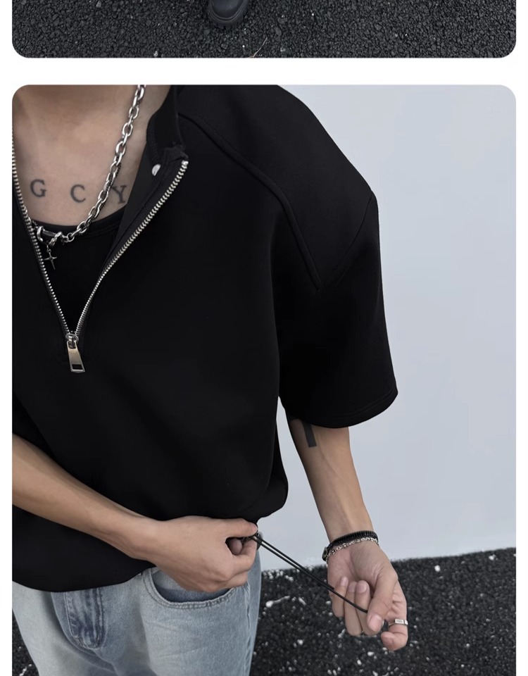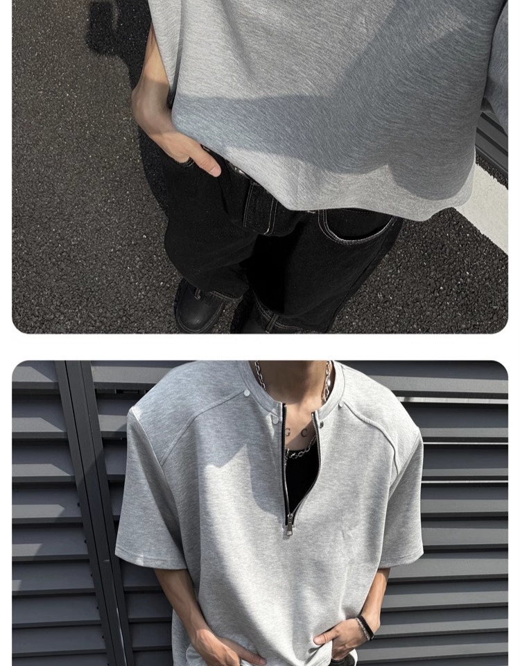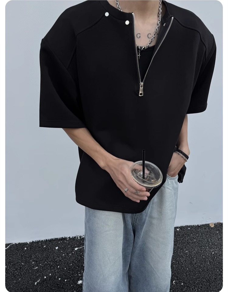 고급 하프 지퍼 어깨 패드 티셔츠 남성용 클렌핏 헤비 쇼트 슬리브 아메리칸 스타일 하이 스트리트 리벳 디자인 하프 슬리브