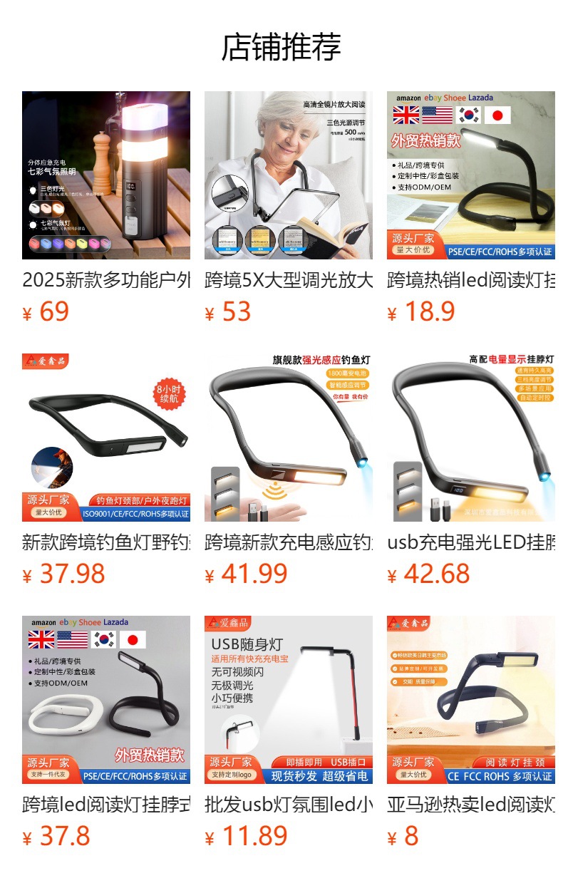 我们专注为跨境电商及外贸企业研发生产跨境爆款灯具,产品涵盖挂脖阅读灯、露营氛围灯、钓鱼灯、USB折叠灯及挂脖放大镜灯等品类。提供样品定制、OEM/ODM服务,默认采用英文中性包装。特别说明:若为国内自用或转售需求,请联系我们更换中文标识包装,我们将优先响应。欢迎咨询合作!