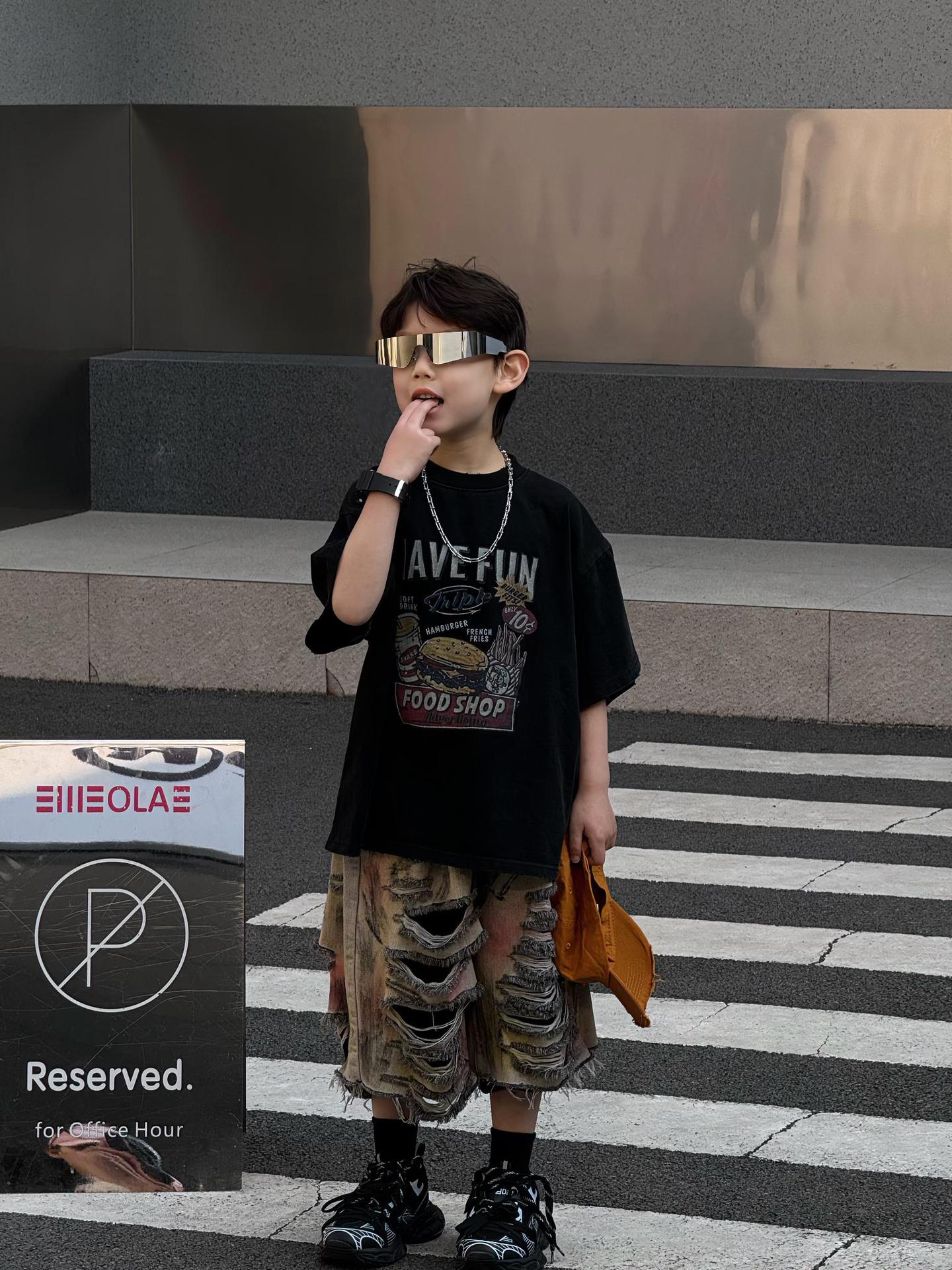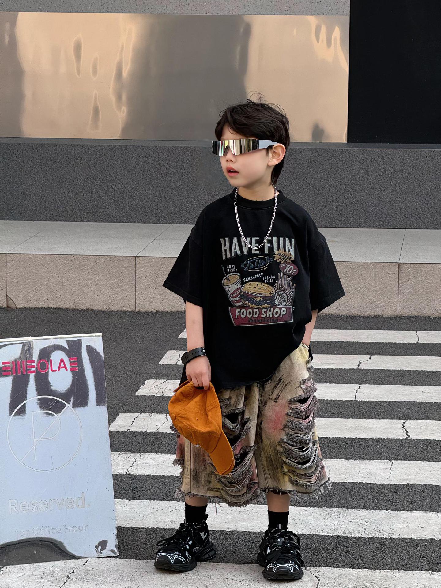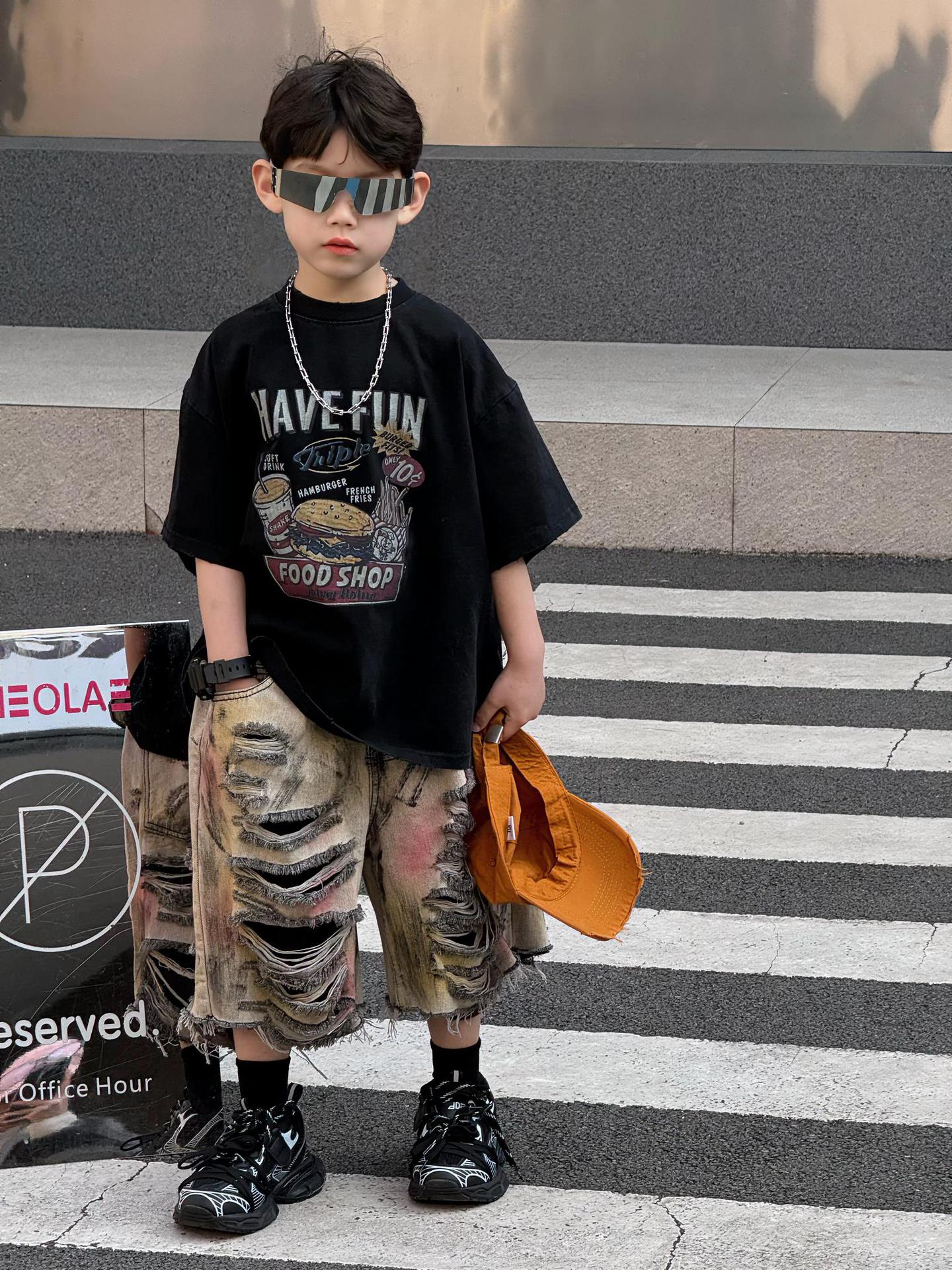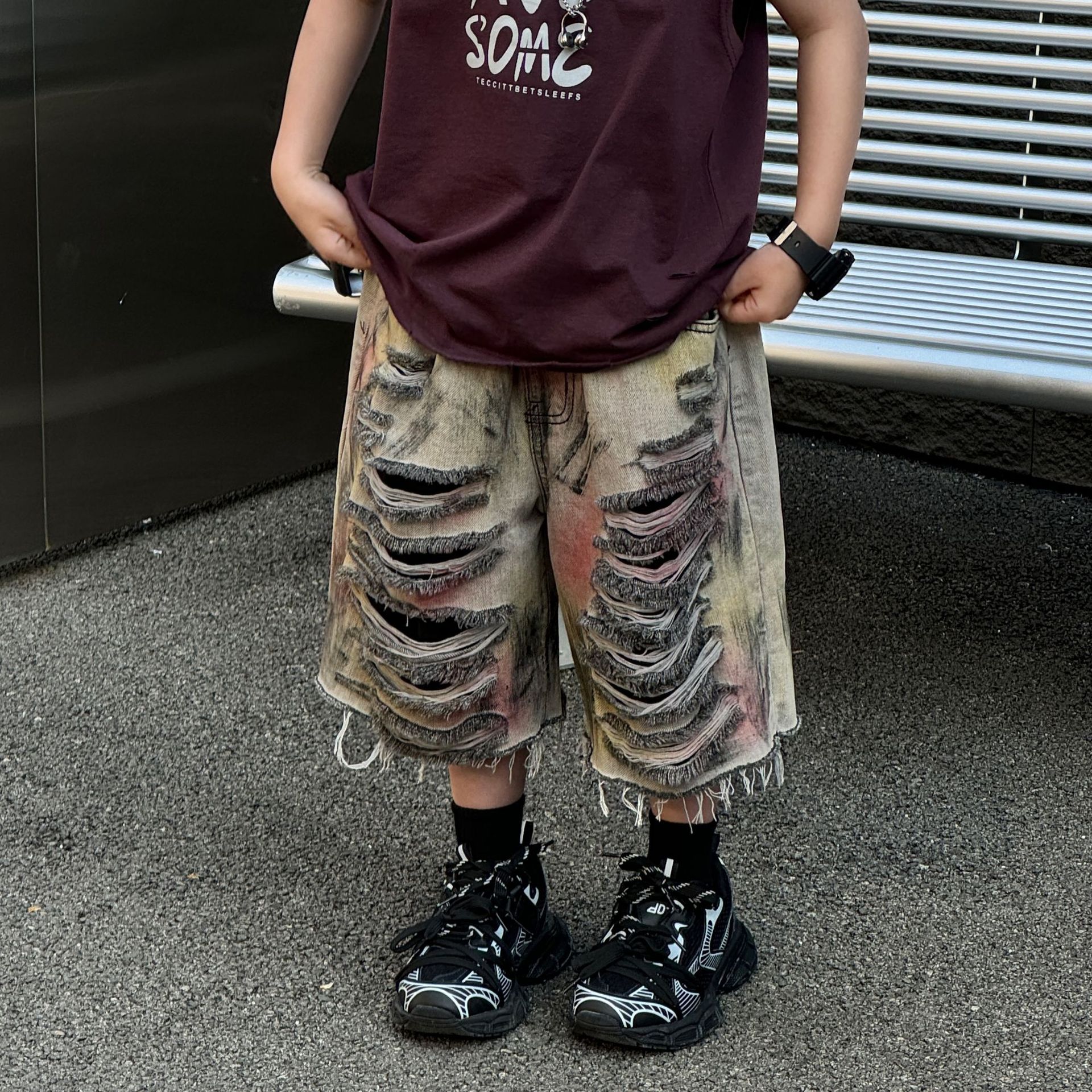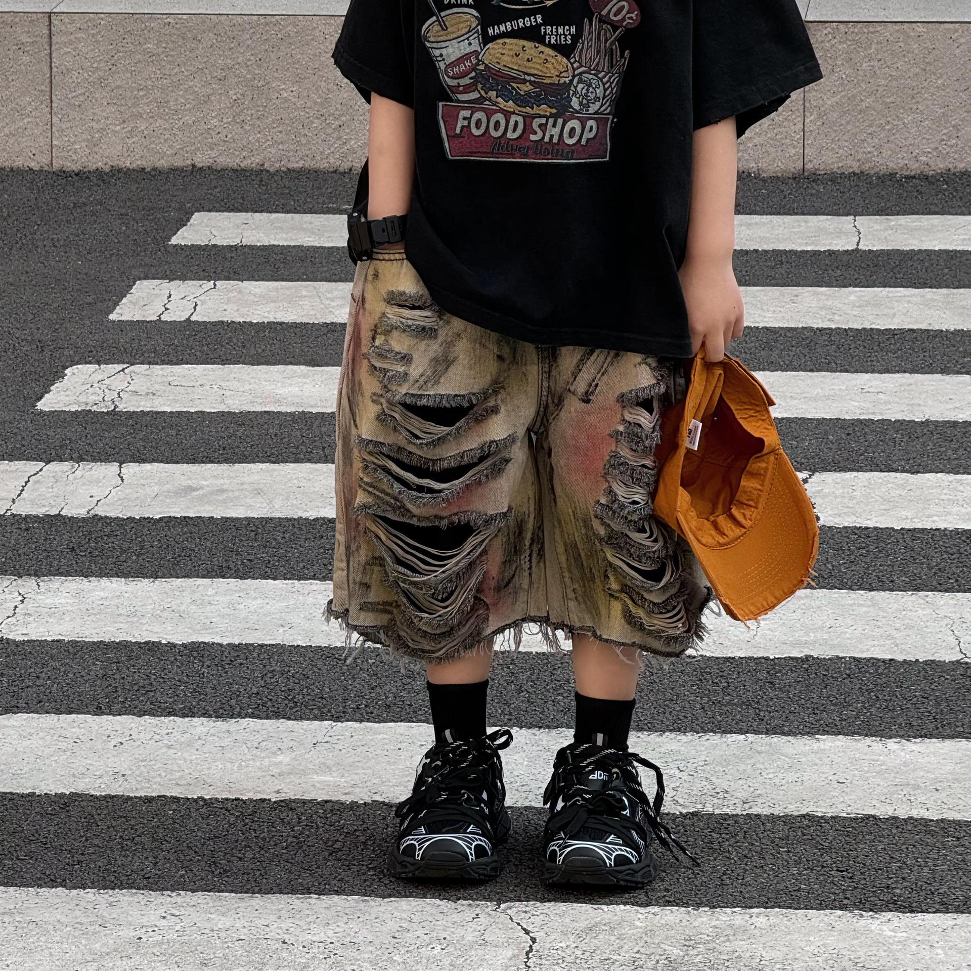 타이루 2025 여름 새 도착 한국식 소년 올매치 디자인 센스 스트리트 아메리칸 리핑 청바지 어린이 반바지스토어 가기