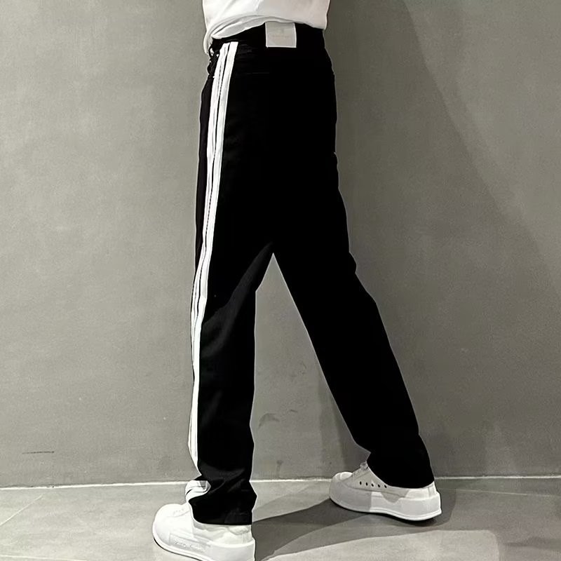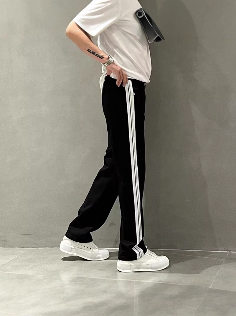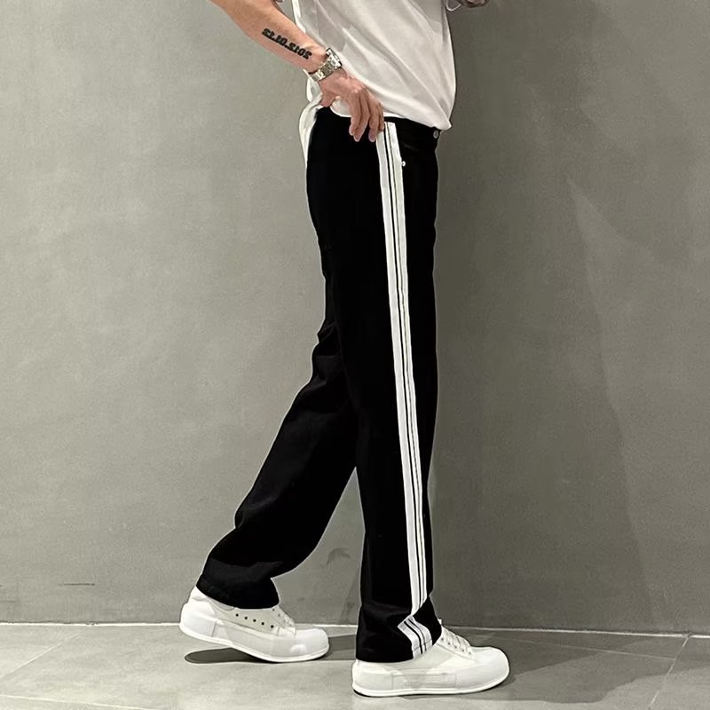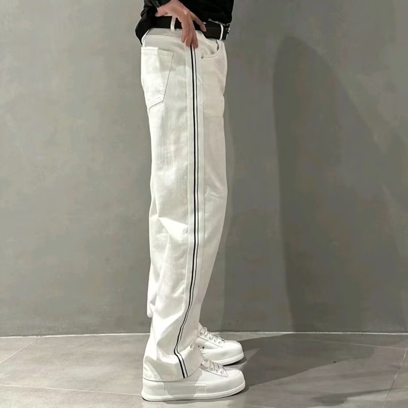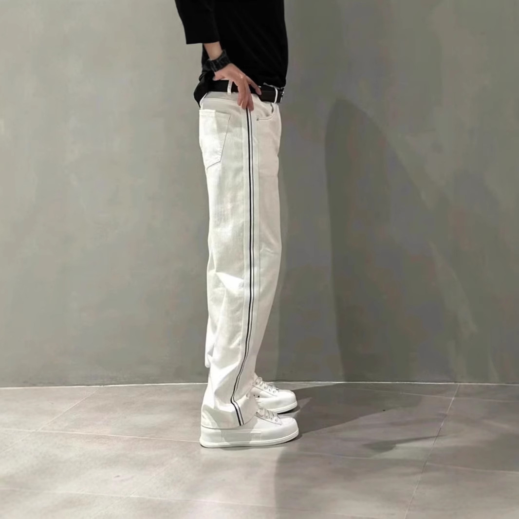 유럽 역 여름 화이트 청바지 남자 2023 새로운 간단한 패션 올 매치 사이드 스트라이프 느슨한 스트레이트 바지스토어 가기