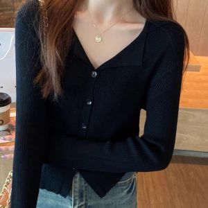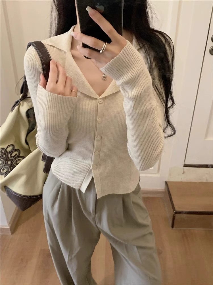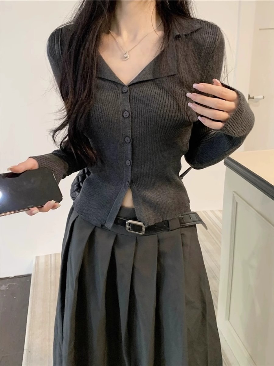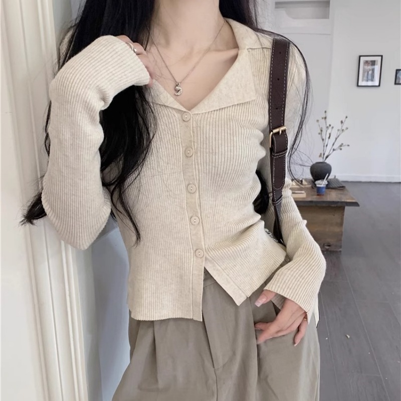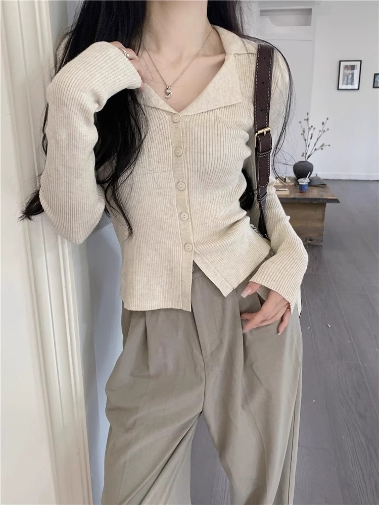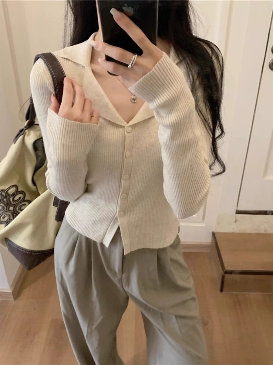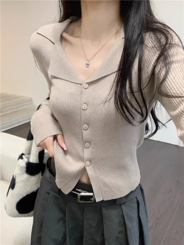 아메리칸 스위트 앤 스파이시 폴로 라펠 니트 가디건 가을 겨울 슬림핏 브이넥 아우터 탑 여성용 시크 베이스 스웨터