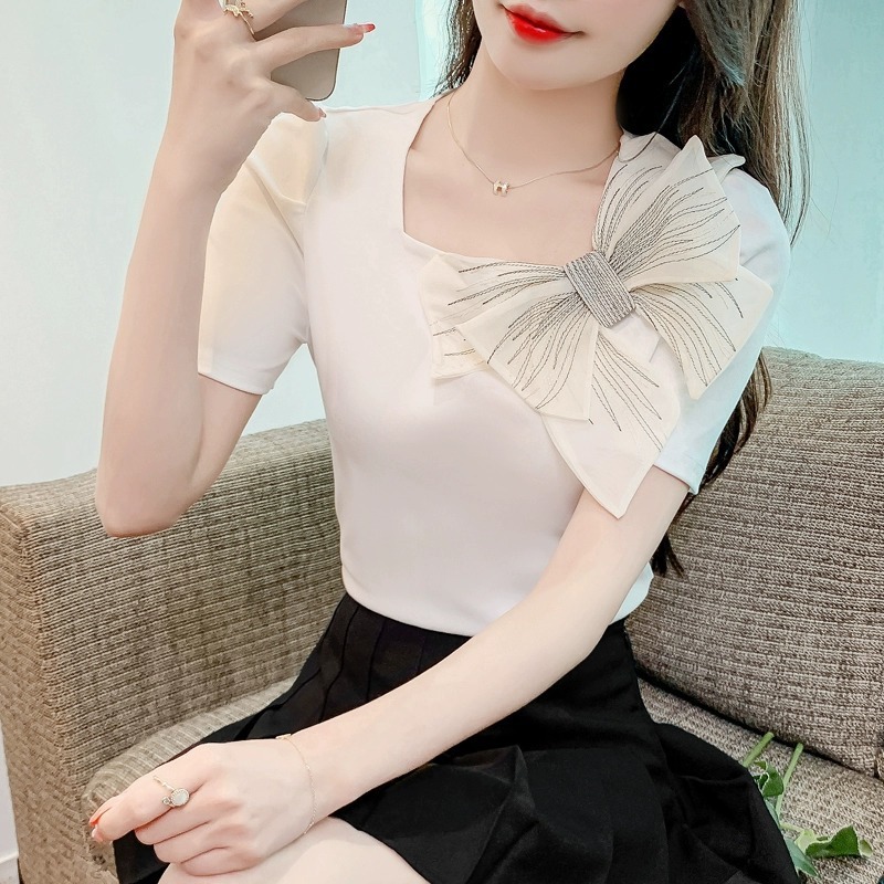 2025 년 여름 새로운 스퀘어 칼라 활 반팔 티셔츠 바느질 여성 디자인 틈새 유행 세련된 빅탑스토어 가기