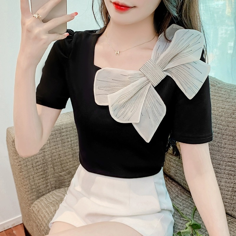 2025 년 여름 새로운 스퀘어 칼라 활 반팔 티셔츠 바느질 여성 디자인 틈새 유행 세련된 빅탑