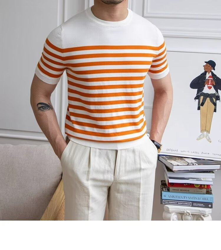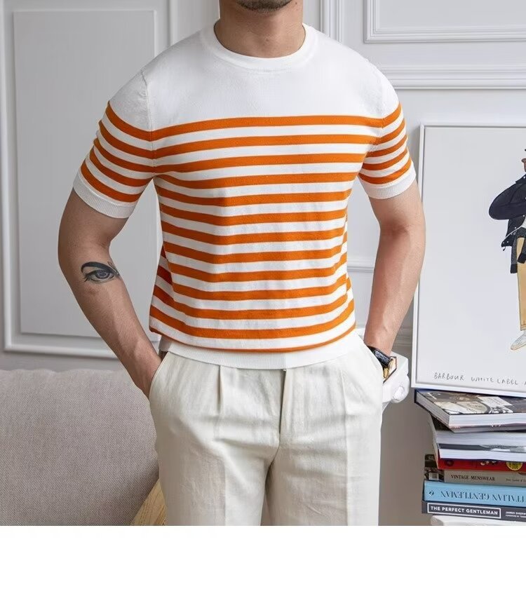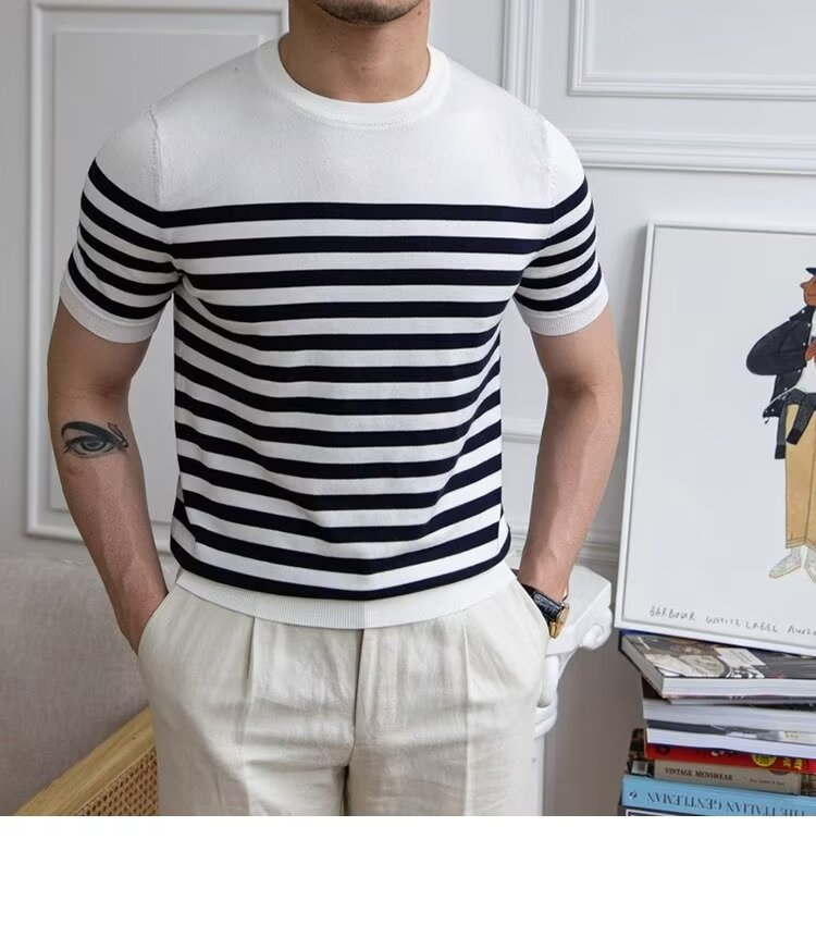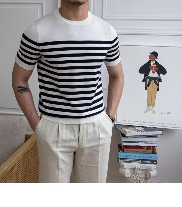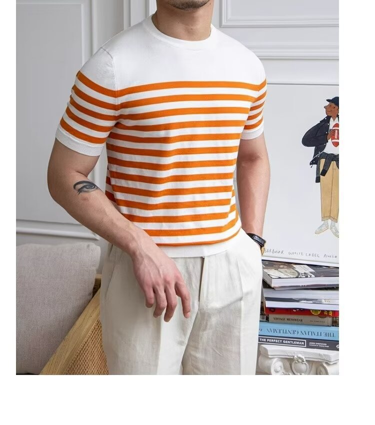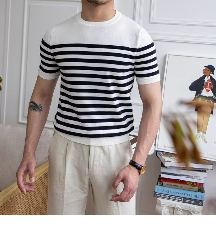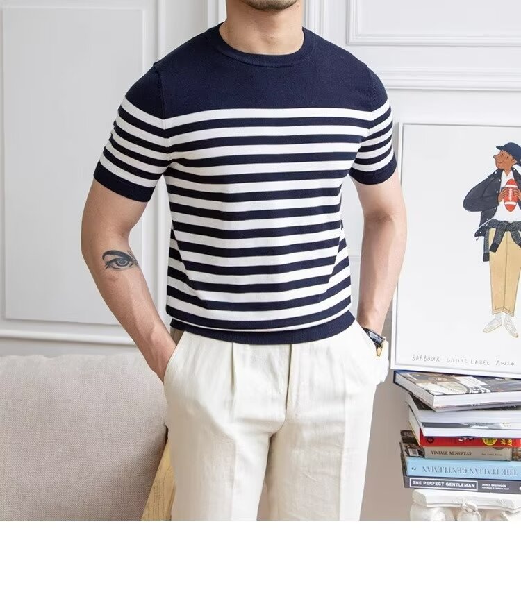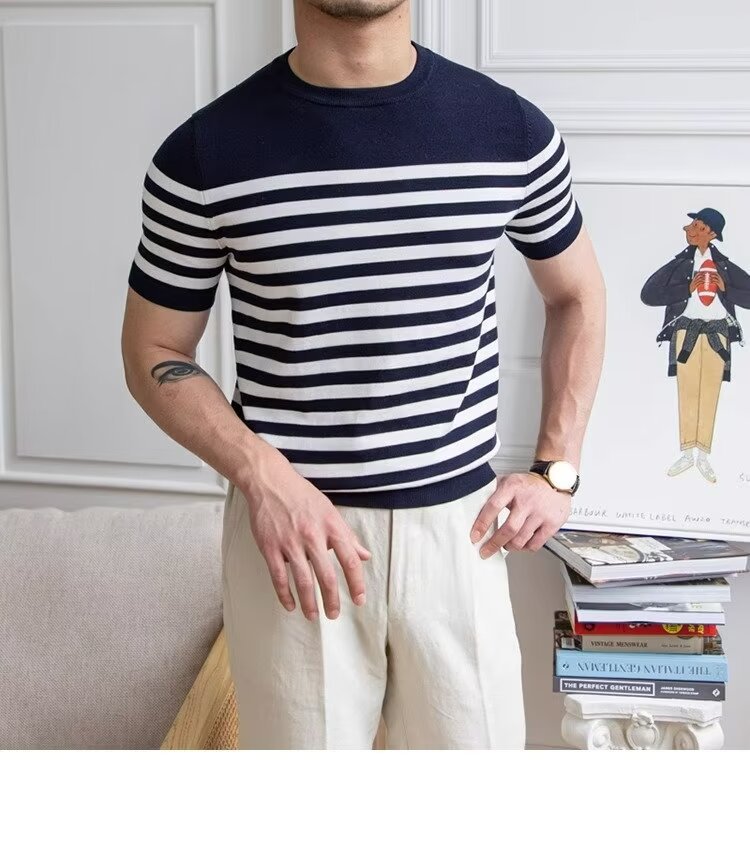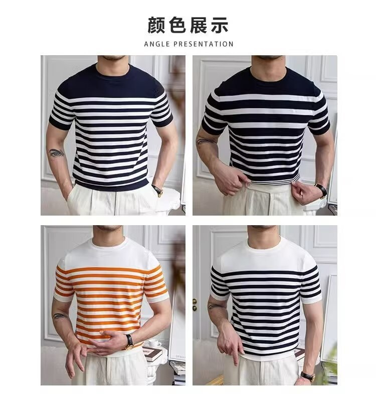 트렌디한 다용도 스트라이프 티셔츠 남성용 반팔 니트 라운드 넥 여름 아메리칸 트렌디 캐주얼 남성용 탑 슬림핏스토어 가기