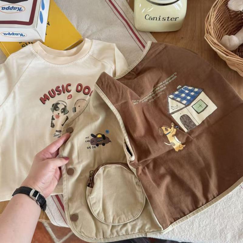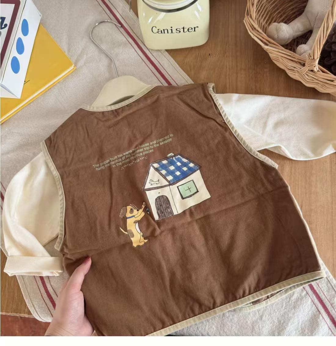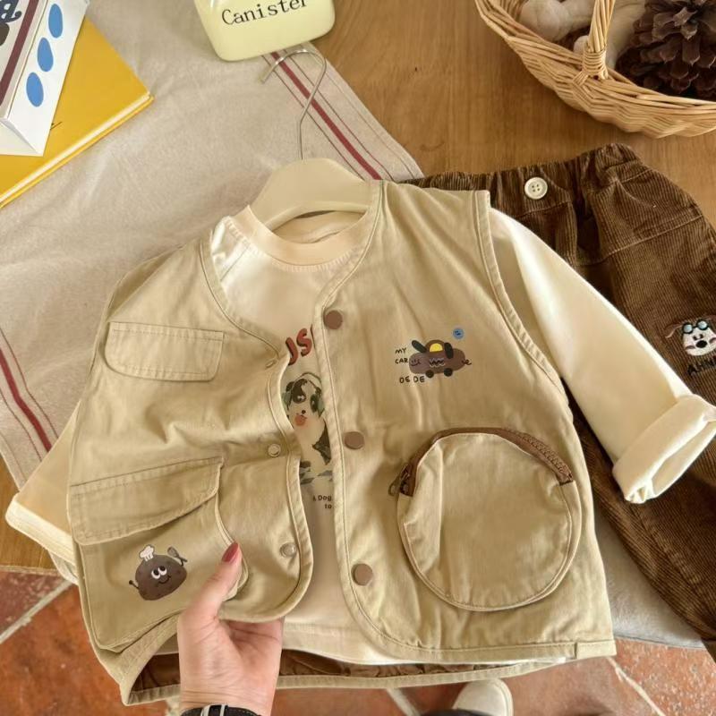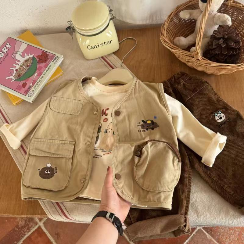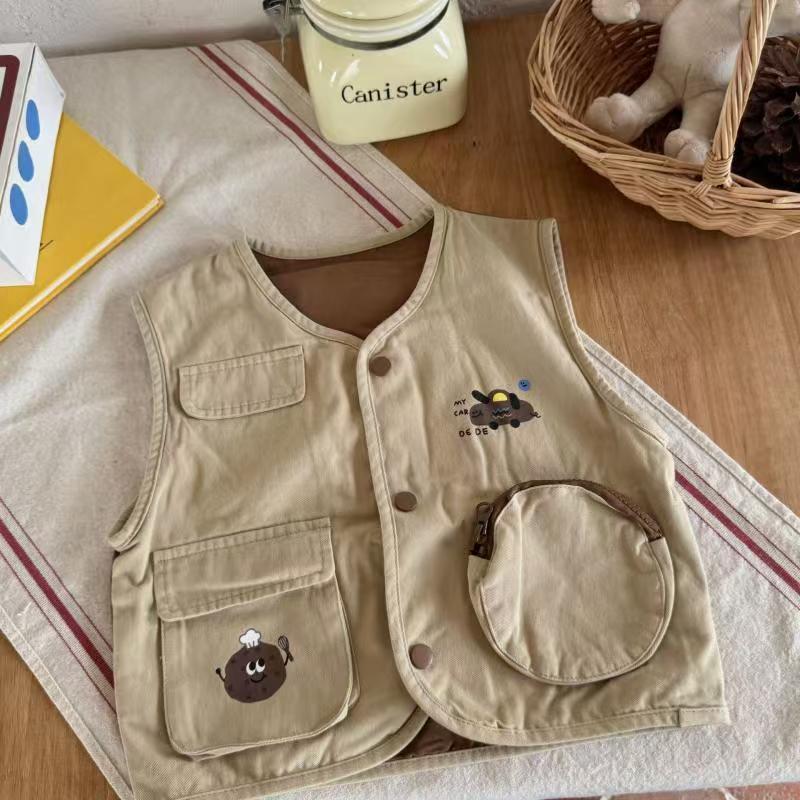 2025년 봄, 가을 한국 스타일 소년 소녀 만화 스타일 워시 코튼 조끼 어린이 입체 포켓 컬러 매칭 조끼 가을스토어 가기