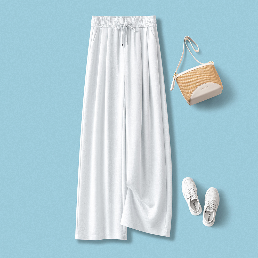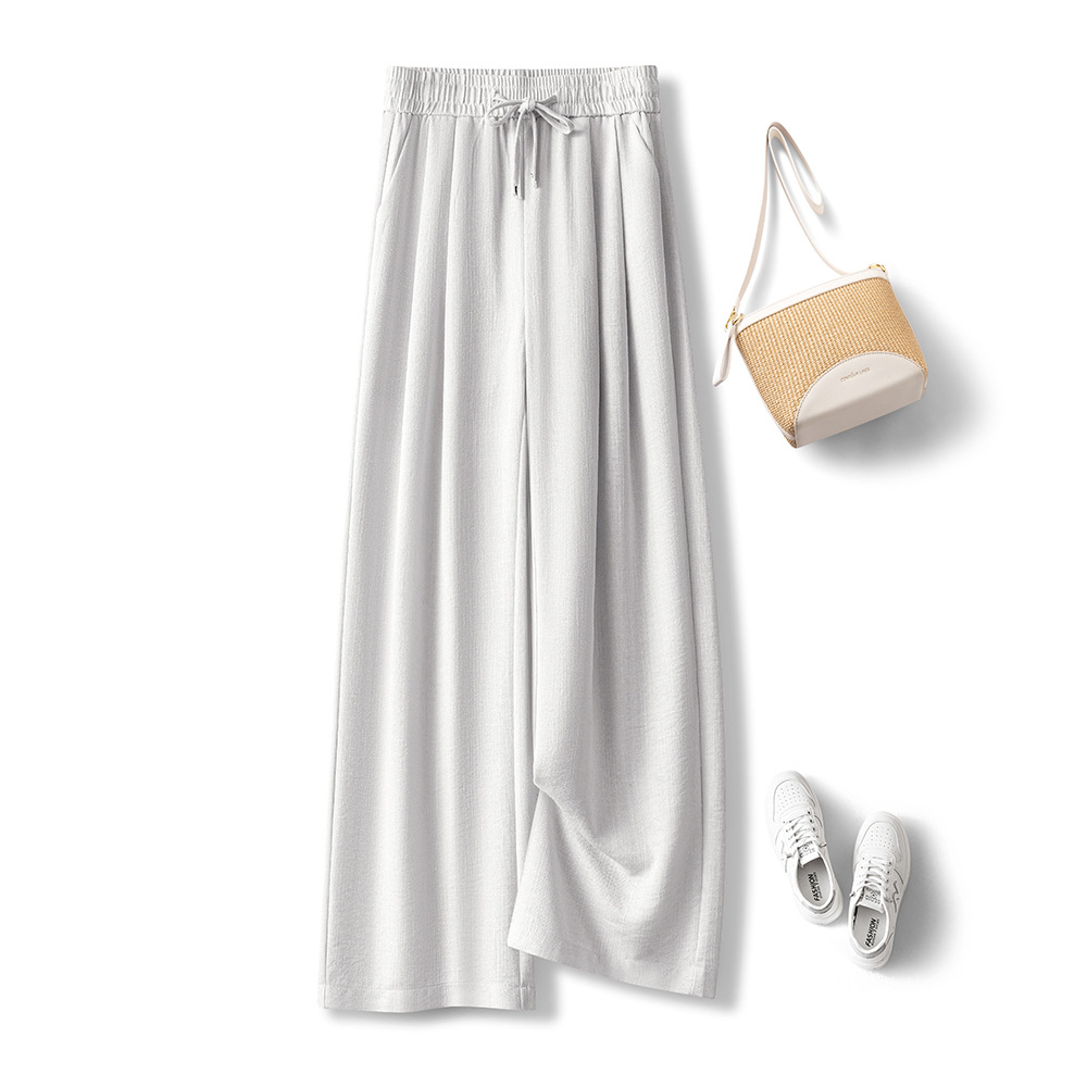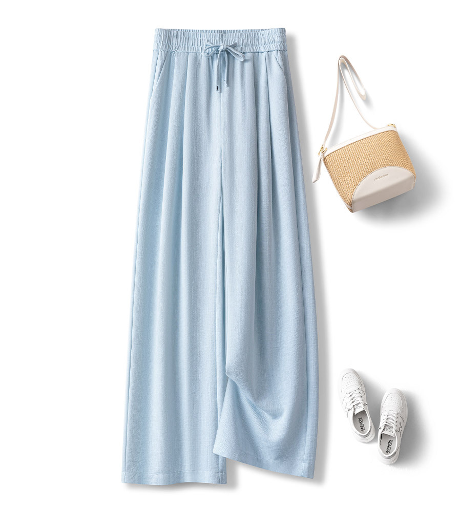 라이트 블루 느슨한 넓은 다리 바지 여자 2025 새로운 여름 통기성 리넨 캐주얼 바지 높은 허리 더미 자른 바지