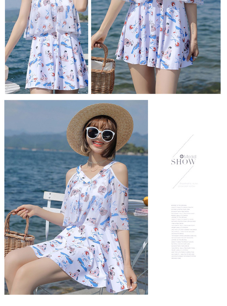 일본식 여성용 수영복 새 인쇄 된 어깨 민소매 메쉬 수영복 스커트 스플릿 바지 홀리데이 스파 수영복스토어 가기