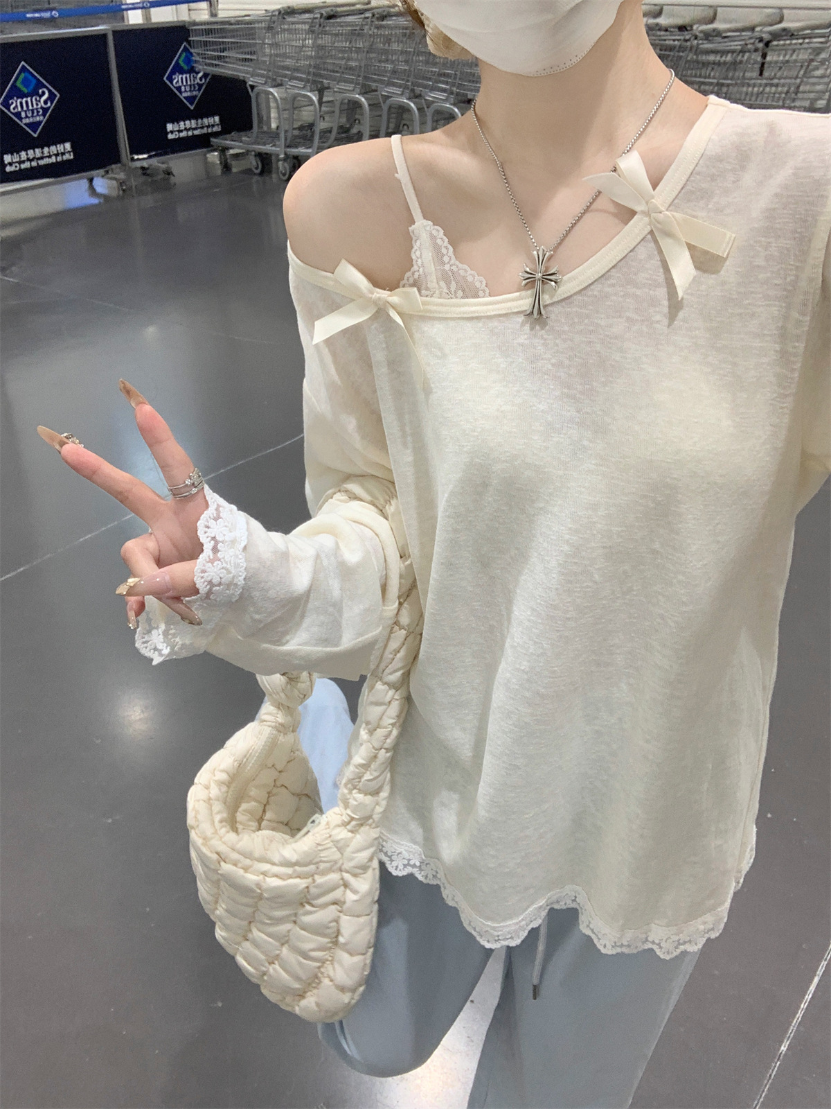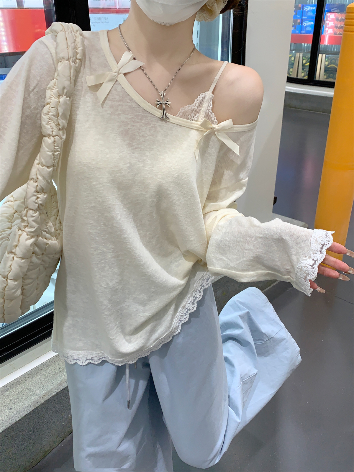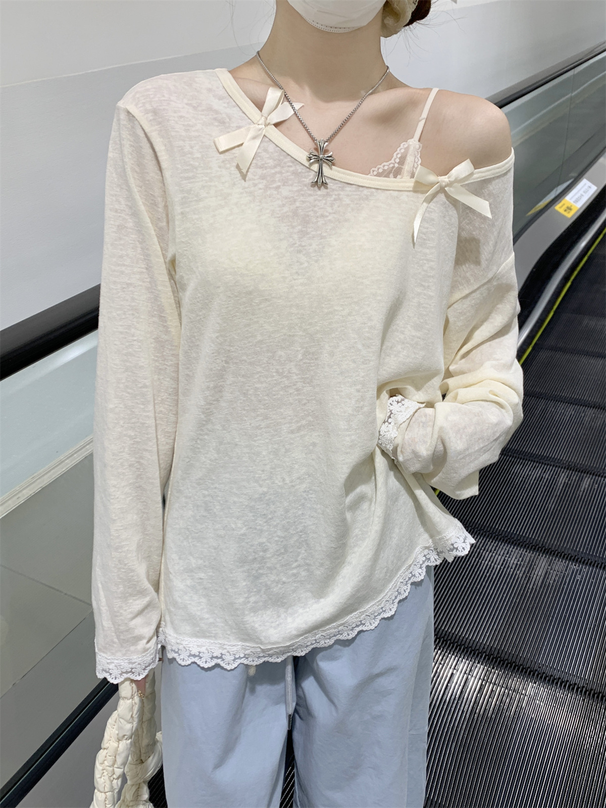 Oblique Collar Bow 긴팔 선 스크린 티셔츠 여성 봄 2025 새로운 한국 스타일 느슨한 블라우스 레이스 바느질 탑스토어 가기