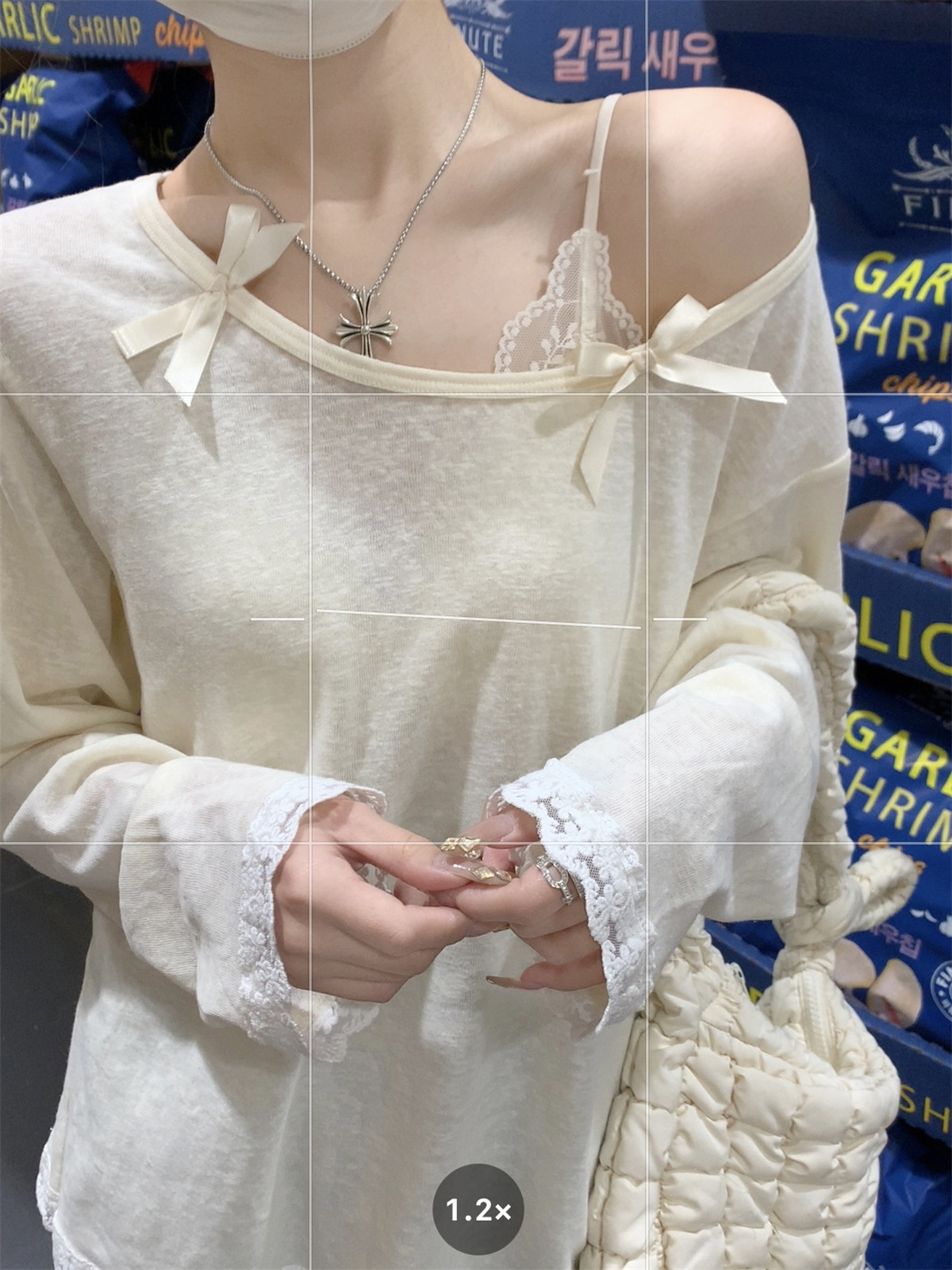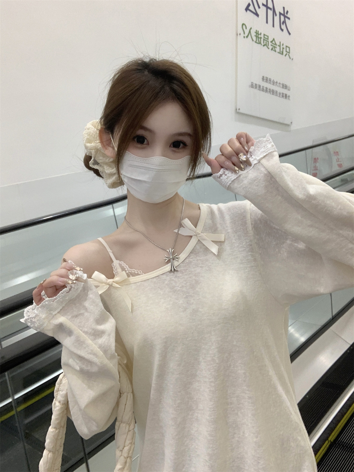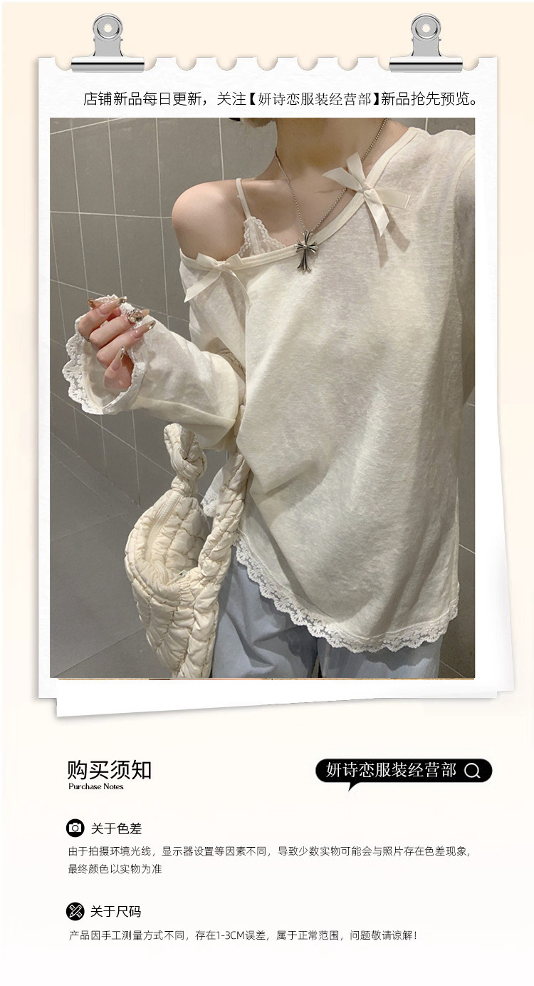 Oblique Collar Bow 긴팔 선 스크린 티셔츠 여성 봄 2025 새로운 한국 스타일 느슨한 블라우스 레이스 바느질 탑스토어 가기