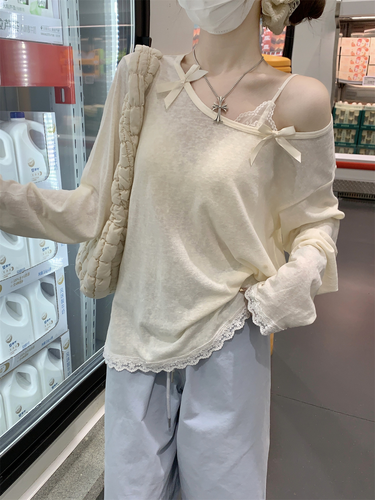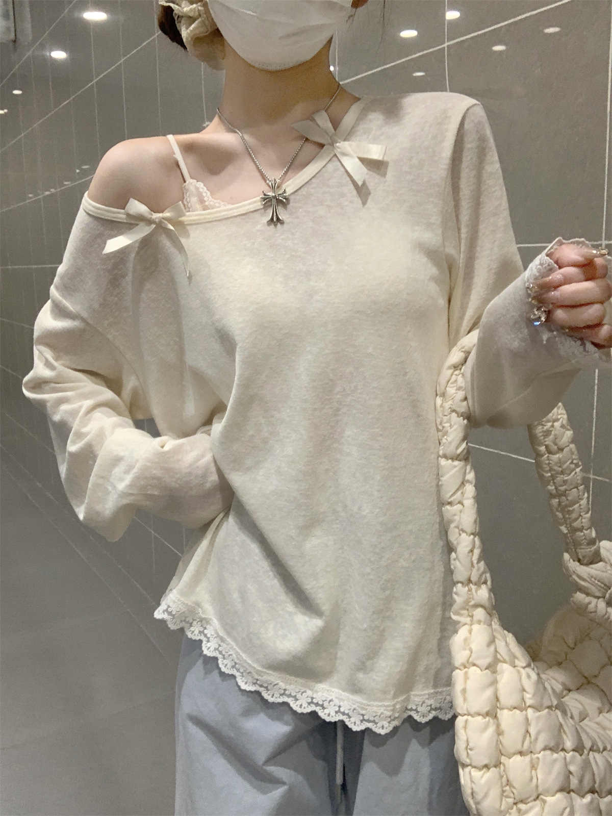 Oblique Collar Bow 긴팔 선 스크린 티셔츠 여성 봄 2025 새로운 한국 스타일 느슨한 블라우스 레이스 바느질 탑