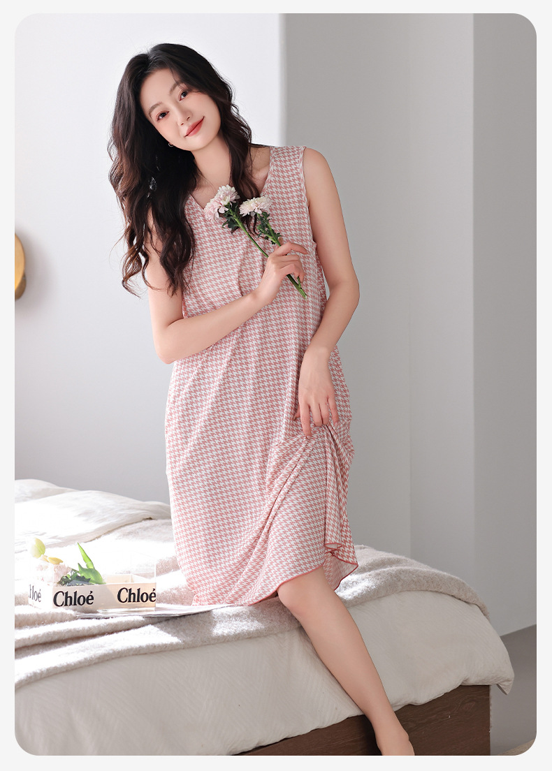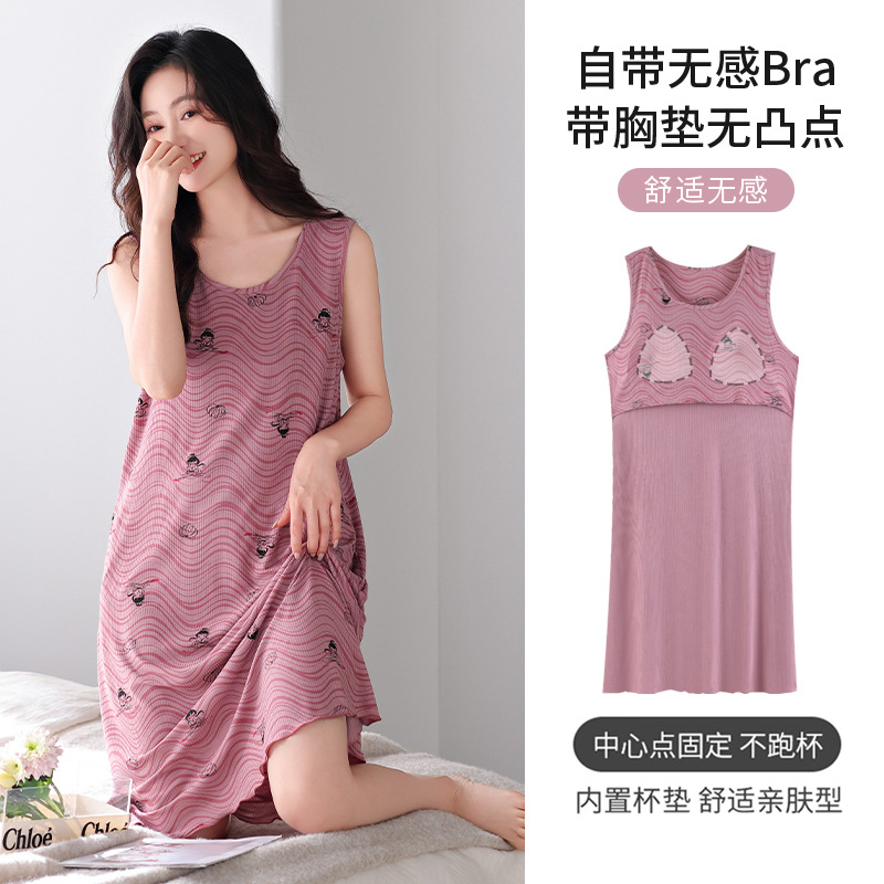 가슴 패드와 함께 나이트 가운 여성의 여름 쿨 모달 얇은 조끼 중간 길이 플러스 사이즈 원피스 여성용 홈 의류스토어 가기