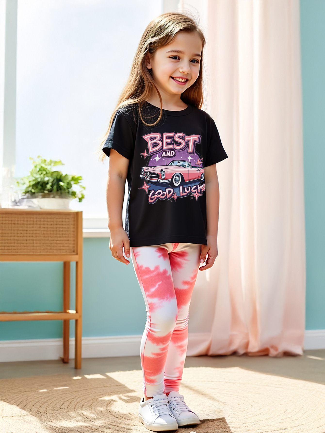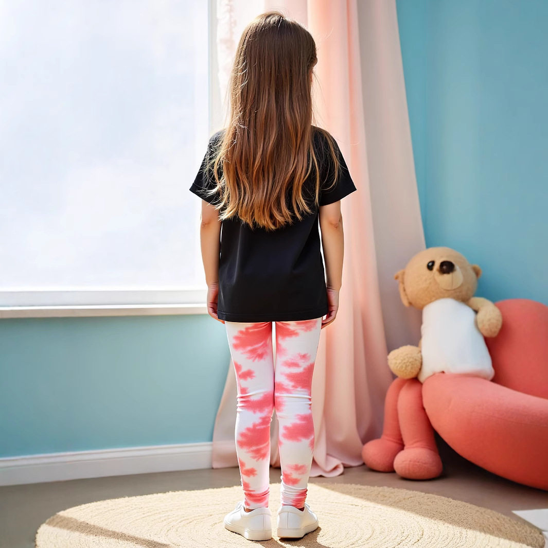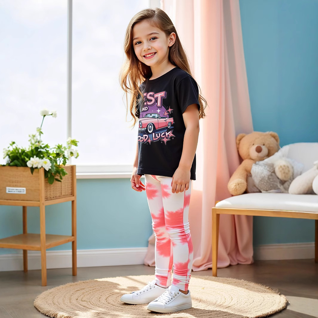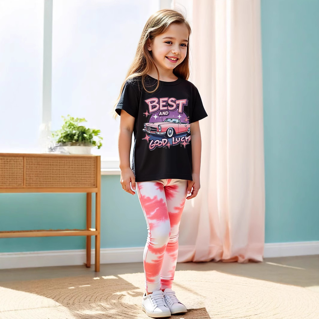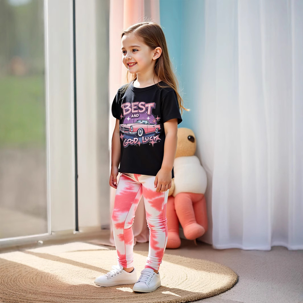 P8467 국경 간 무역 여름 소녀 자동차 인쇄 둥근 목 티셔츠 시원한 타이 염료 효과 디지털 인쇄